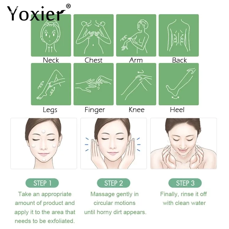 Шея/грудь/рука/спинаНоги/палец/колено/каблукИнструкция1: Возьмите соответствующее количество продукта и нанесите его на область, которую необходимо отшелушивать.2: мягко массируйте круговыми движениями, пока не появится Роговая грязь.3: наконец, снимите краску с чистой водой