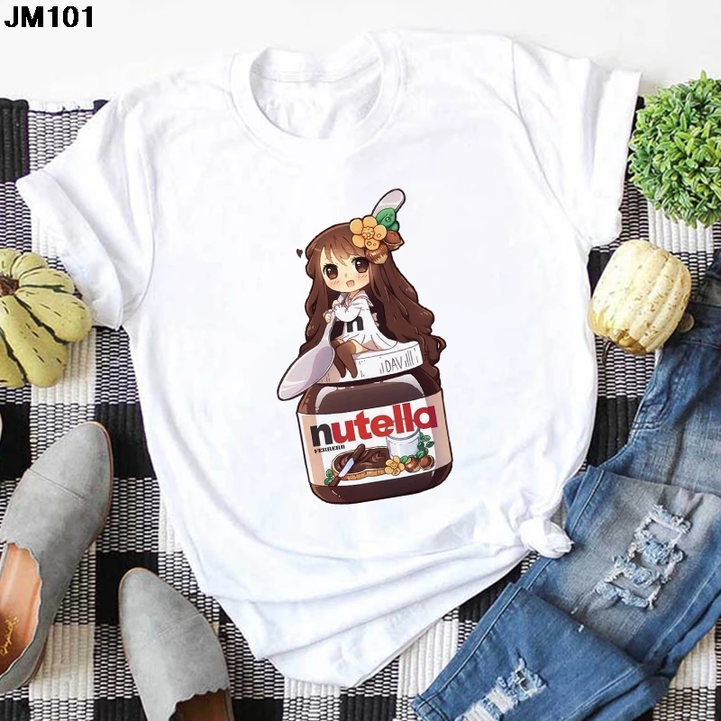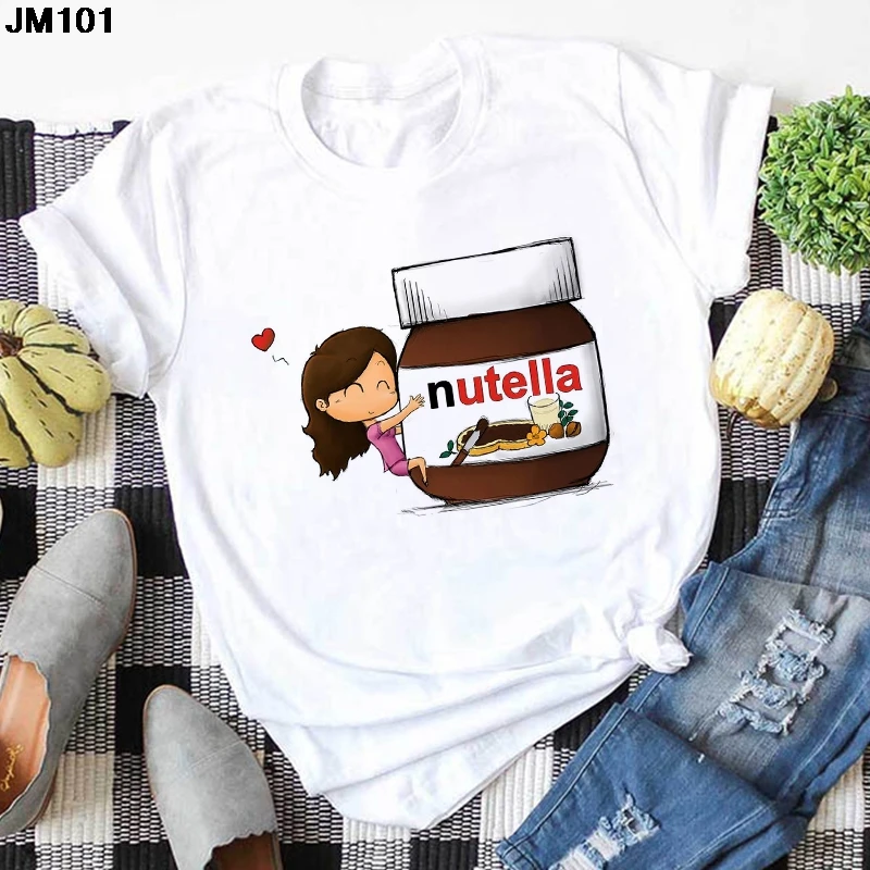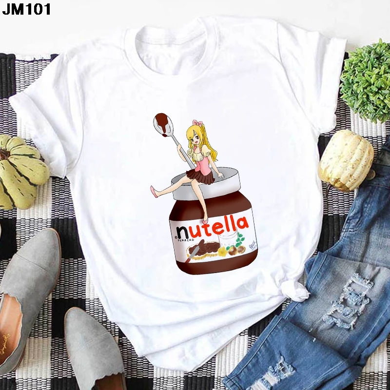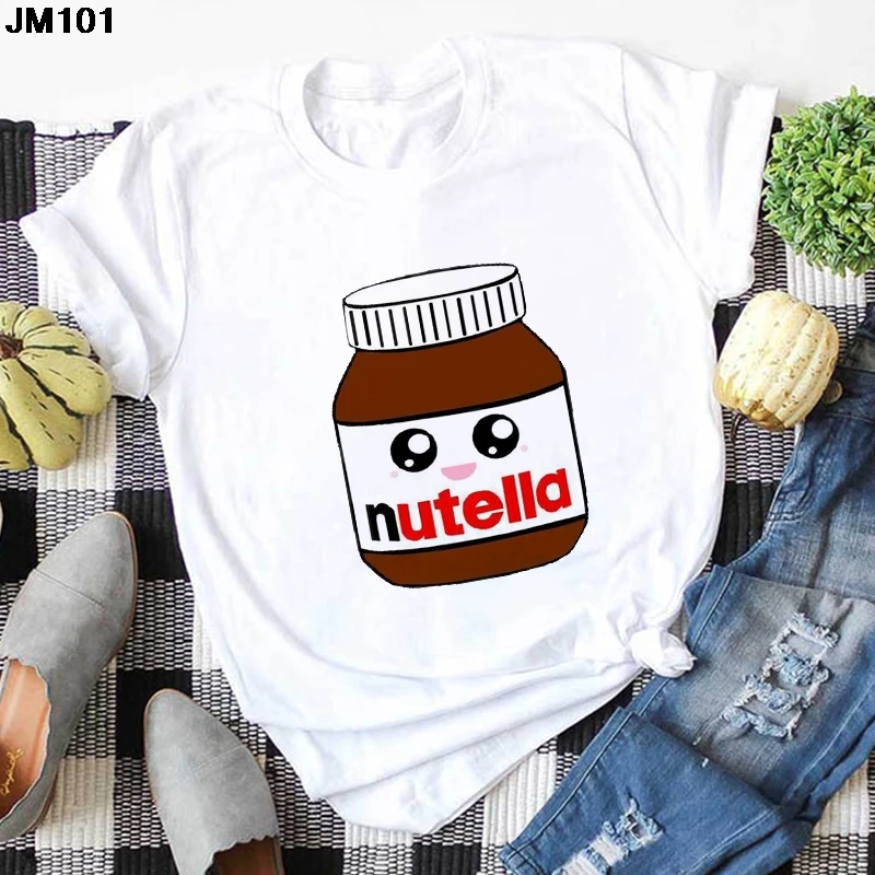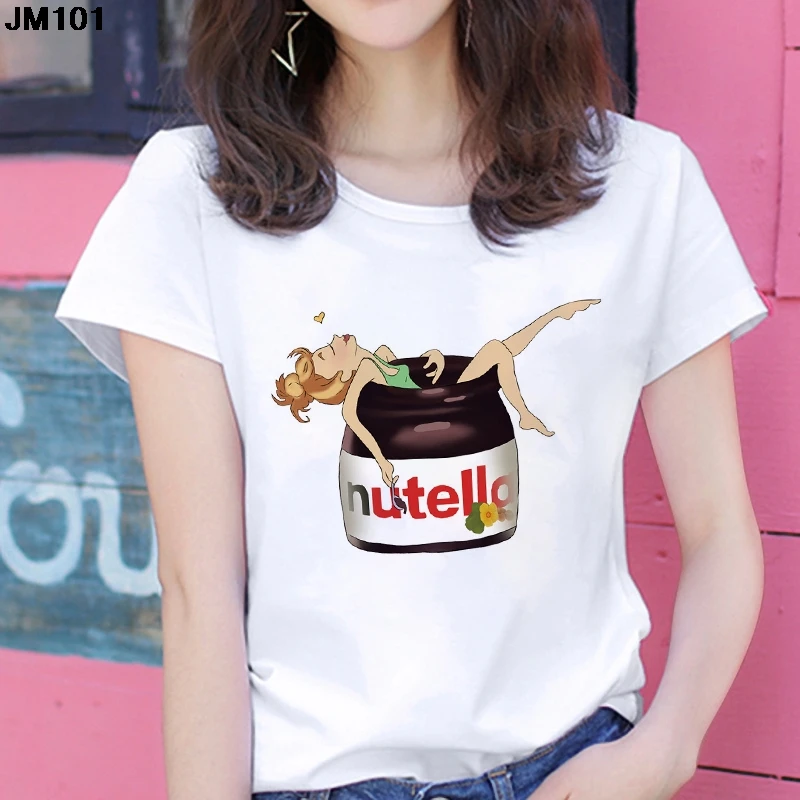 Новая летняя женская футболка с милым принтом Nutella, женская футболка в стиле Харадзюку, женские топы с круглым вырезом, футболка, модная забавная белая футболка