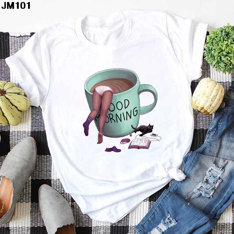 Повседневная Женская модная футболка с принтом кофейной девушки, ле...
