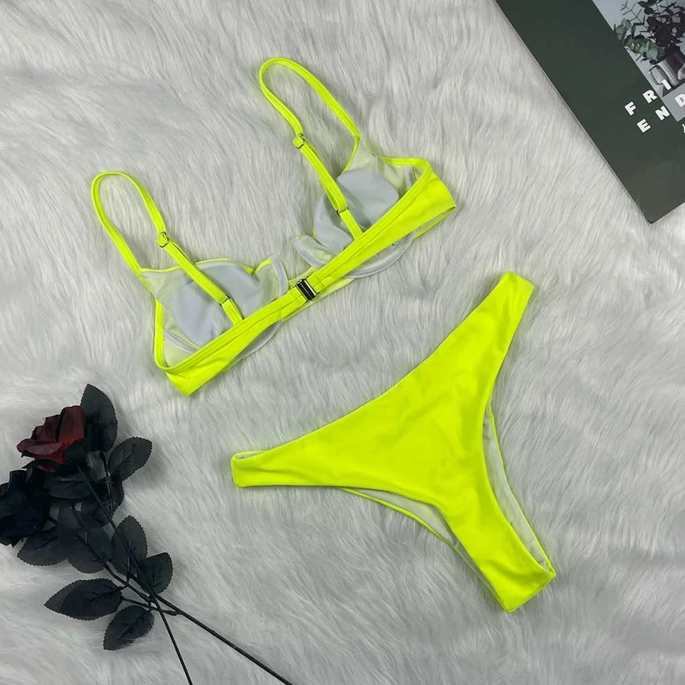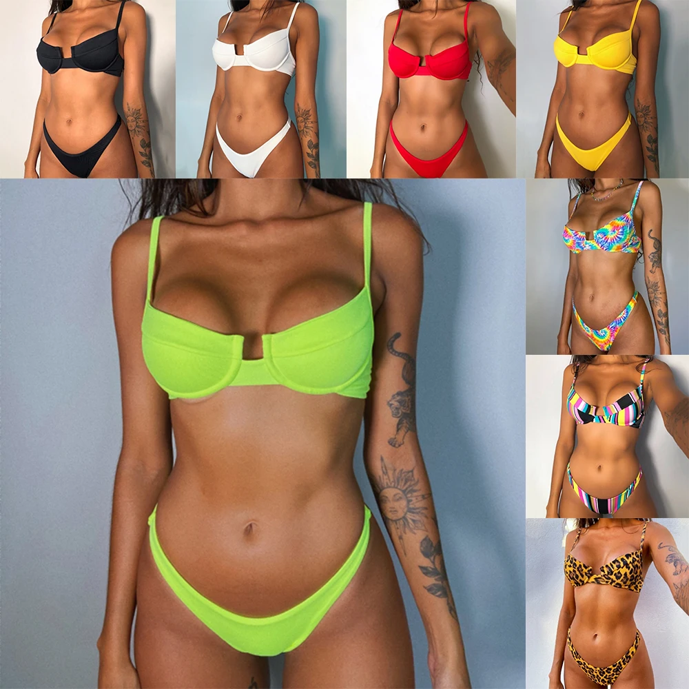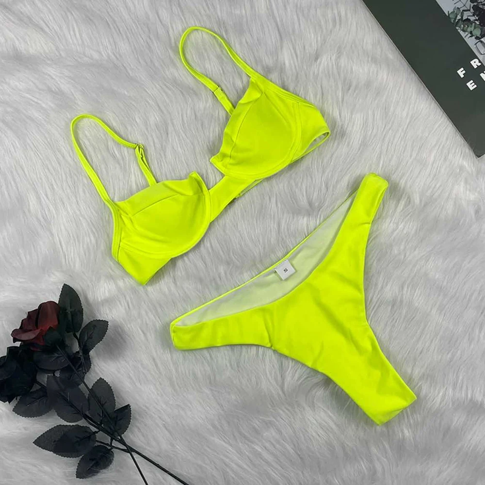 Летний женский сексуальный купальник из двух предметов, женский купальник, комплект бикини с флуоресцеином, однотонные купальные костюмы, пляжная одежда