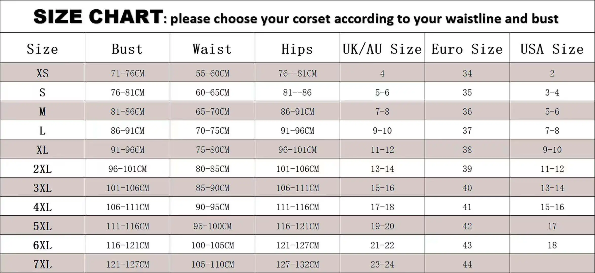 Таблица размеров: пожалуйста, выбирайте корсет в соответствии с линией талии и бюста