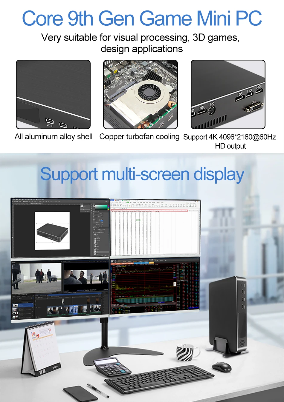 1) Процессор 9-го поколения, I3-9100F I5-9400F I7-9700 i9-9900T с высокой производительностью;2) двухканальная DDR4, более быстрая загрузка и более быстрая реакция;3) M.2 высокоскоростной твердотельный привод, более быстрое и стабильное чтение и запись;4) Поддержка 2,5-дюймов механический жесткий диск, надежное хранение данных;5) Поддержка многоэкранного дисплея, работа во время развлечения;6) полностью медный турбо-вентилятор, высокоскоростной теплоотвод, отсутствие шума;7) Встроенный модуль Intel 9260 Gigabit WiFi, bluetooth5.0;8) оснащен независимой видеокартой, высокой производительностью и приятными Играми;9) применяется для дома, офиса, цифровых вывесок, киосков, рекламных машин, терминалов самообслуживания, электронных досок, атм, пос/розница, сетей, автоматизации, систем наблюдения парковки, канальная система, медицинские электронные и т. Д.