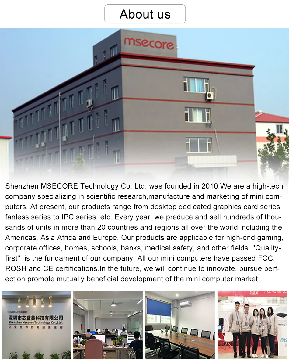 MsecoreБыл основан на исследованиях и разработках мини-ПК и создан ряд продуктов, адаптированных к рыночному спросу на основе многолетнего опыта. Это дискретные графические серии, безвентиляторные офисные серии и промышленные компьютерные серии. Msecore имеет очень разумные цены и стабильное качество, и очень популярен в различных отраслях промышленности.Наша цель-предоставить нашим дистрибьюторам и агентам высококачественную продукцию с разумной ценностью. В последние годы команда Msecore сосредоточена на разработке большего количества новых ПК, таких как промышленные компьютеры и прочные планшеты. Мы также завоевали правительство и корпоративные многие проекты достигли хороших результатов, отзывы, Приглашаем присоединиться к нам и разработать более Инновационный бизнес компьютерной продукции! Давайте!