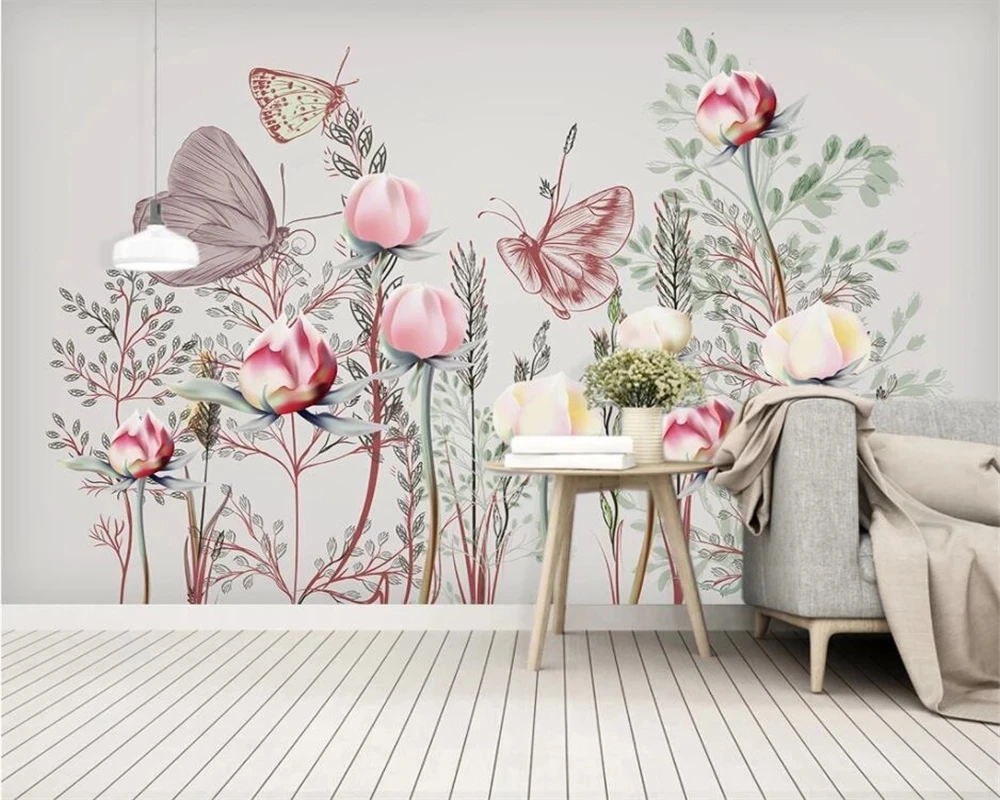 Самоклеящиеся 3D обои на заказ, простые обои с изображением розовых цветов, бабочек, фона, украшение для дома, гостиной, спальни
