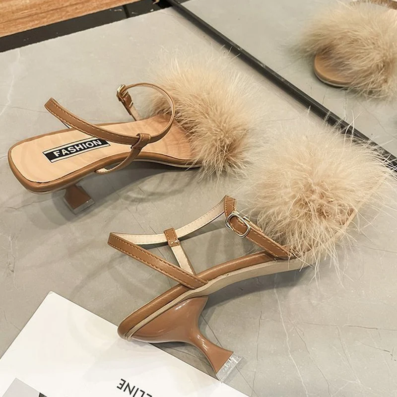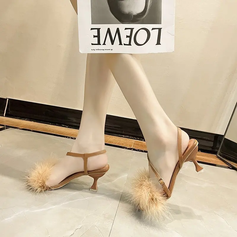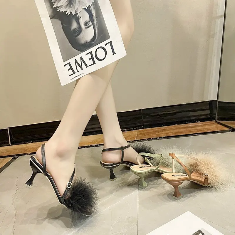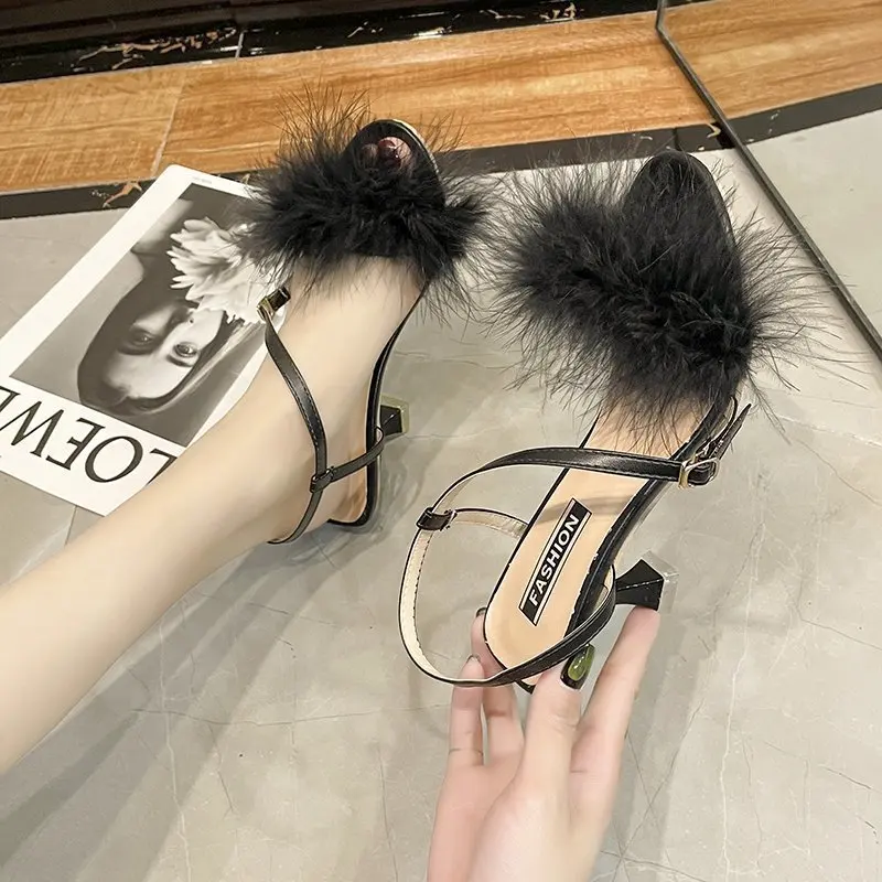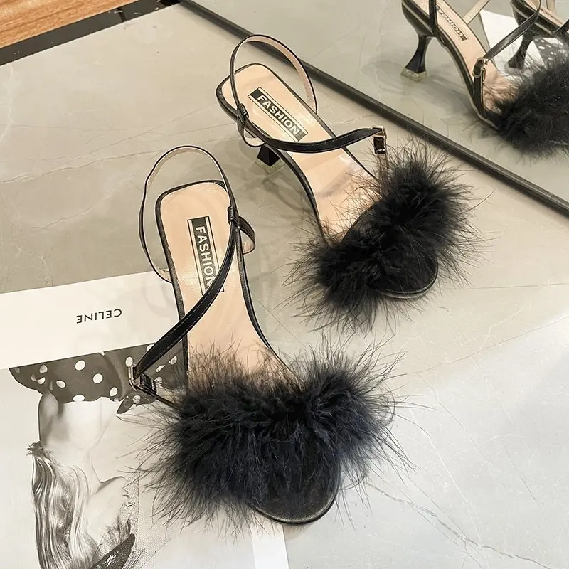 Новинка, черные женские босоножки, Сексуальные Босоножки с открытым носком и мехом, летние босоножки на высоком каблуке, женская обувь BC350