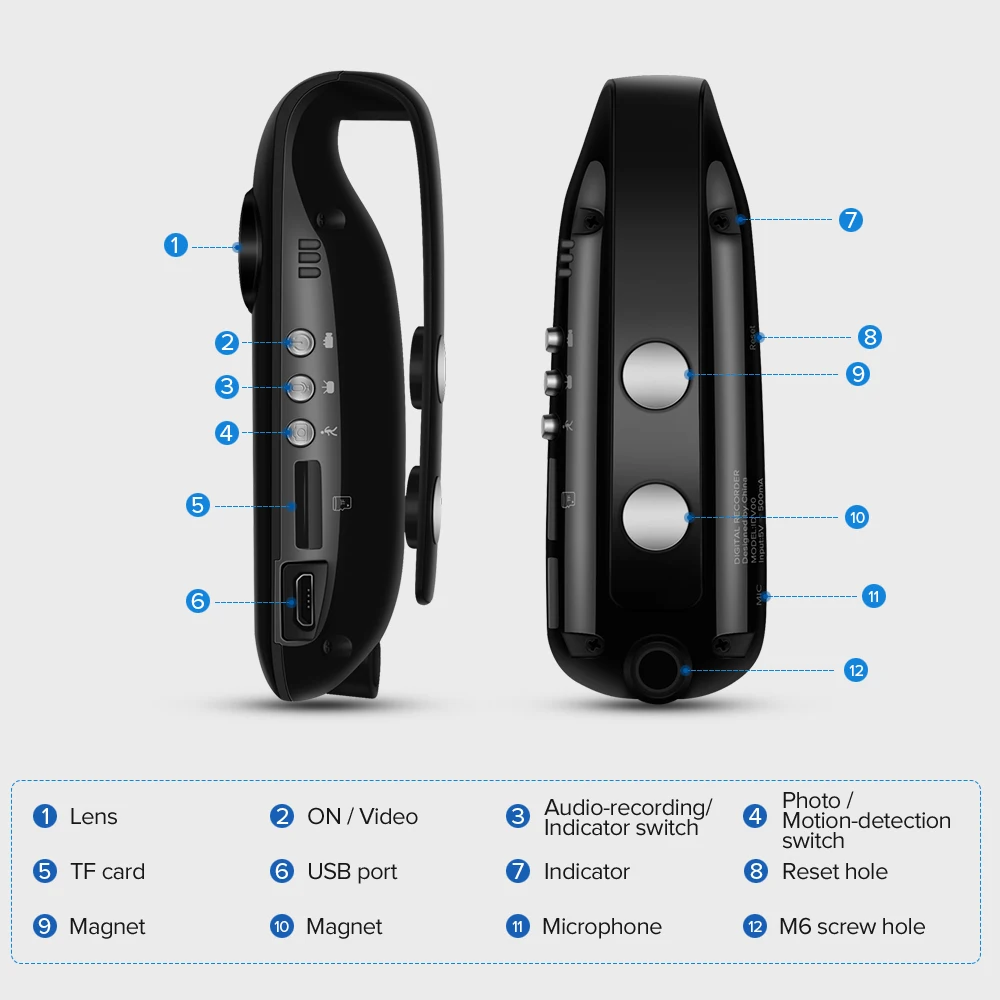 Особенности: 1 высокое качество изображения 2 импортные HD линзы 3 компактный дизайн, портативный держатель DV 4 Формат видео: 1280x720,1920x1080 5 Поддержка обнаружения движения 6 высокоскоростной интерфейс передачи данных USB 2,0 Поддержка карт micro SD 7 128 ГБ 8 видеозаписей около 3 часов 9 циклическая запись и запись видео во время зарядки поддерживается Параметры: Формат видео: AVI Кодирование видео: M-JPEG Разрешение видео: 1920x1080HD Пропорция изображения: 16:9 Частота кадров видео: 30fbs Медиаплеер: популярный видеоплеер Тип интерфейса: Micro 5Pin USB Suupport для хранения: SDHC или SDXC (поддержка 128 ГБ) micro SD карта Тип батареи: высокомощная полимерная литиевая батарея