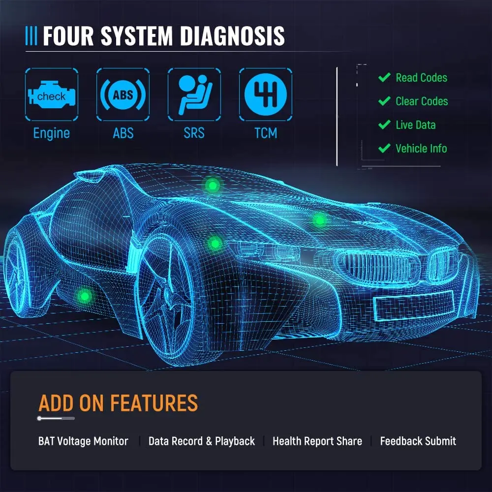Система двигателя:Диагностический инструмент может помочь в обнаружении зажигания двигателя, впрыска топлива, соотношения воздуха и топлива и условий выбросов выхлопных газов в системе двигателя для повышения производительности транспортного средства, экономии энергии и сокращения выбросов выхлопных газов.Передача:Это имеет большой смысл в безопасном вождении, когда ваш автомобиль соскальзывает или трудно изменить. Этот диагностический сканер может решить проблемы с помощью кодов чтения в системе передачи, или проверить состояние здоровья с помощью просмотра данных в режиме реального времени.Система ABS:Диагностика проблемы ABS всегда должна начинаться с визуального осмотра всех тормозных компонентов, затем вам нужно будет получить коды ABS, чтобы сказать вам, где проблема, И это то, что этот сканер делает для вас.SRS система подушки безопасности:SRS, система безопасности, состоит из датчиков удара, модуля управления и сами подушки безопасности, и это диагностическое устройство может обнаружить Каждый электронный параметр, чтобы проверить его состояние здоровья.