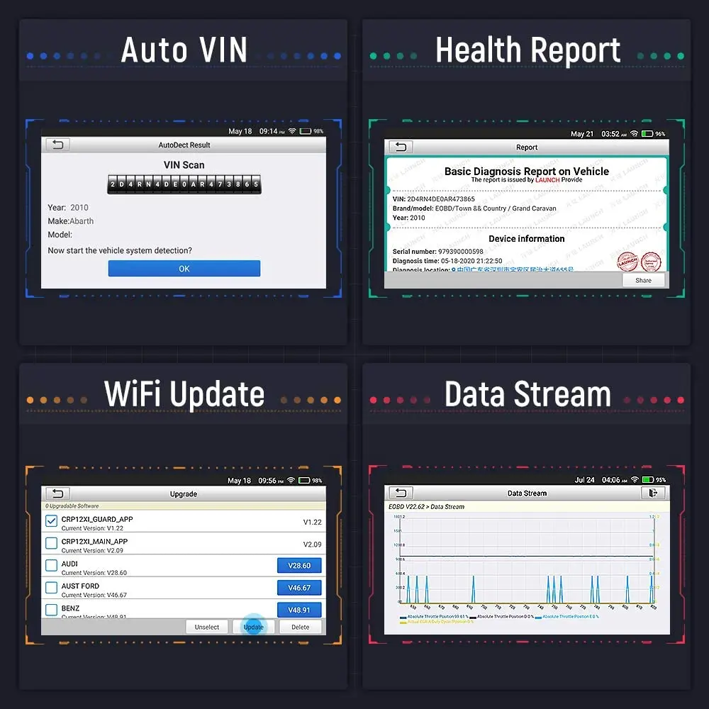 * Диагностика двигателя/ABS/ SRS/системы передачи + Полные функции OBDII* Автоматическое определение: автоматическое получение информации о транспортном средстве.* Здоровье батареи: Нажмите, чтобы просмотреть состояние напряжения батареи на диаграмме.* Диагностический отчет: печать и автоматическая отправка по электронной почте.* Обновление в один клик: бесплатное обновление в один клик через Wi-Fi.* Проверка смога: Быстрая проверка готовности транспортного средства к "испытанию смога".* Просмотр потока данных: запись, воспроизведение, просмотр DTC и отзывы доступны.* Захват экрана: Сохраните страницу вопроса для еще одной проверки.* Перезаряжаемая батарея: встроенный литий-ионный аккумулятор емкостью 6100 мАч.
