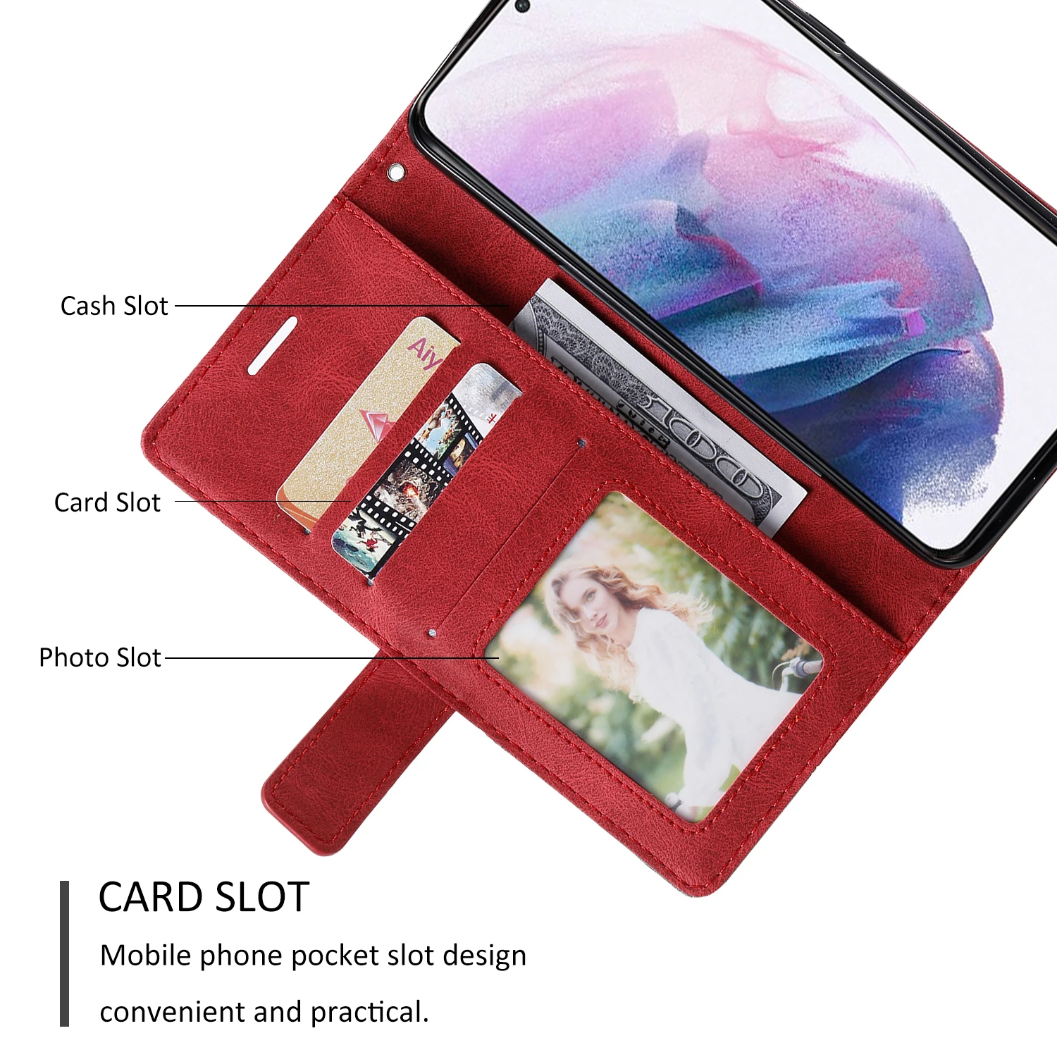 ●Функция: откидная подставка + сложенный кошелек + слот для карт + зажим для денег + фоторамка