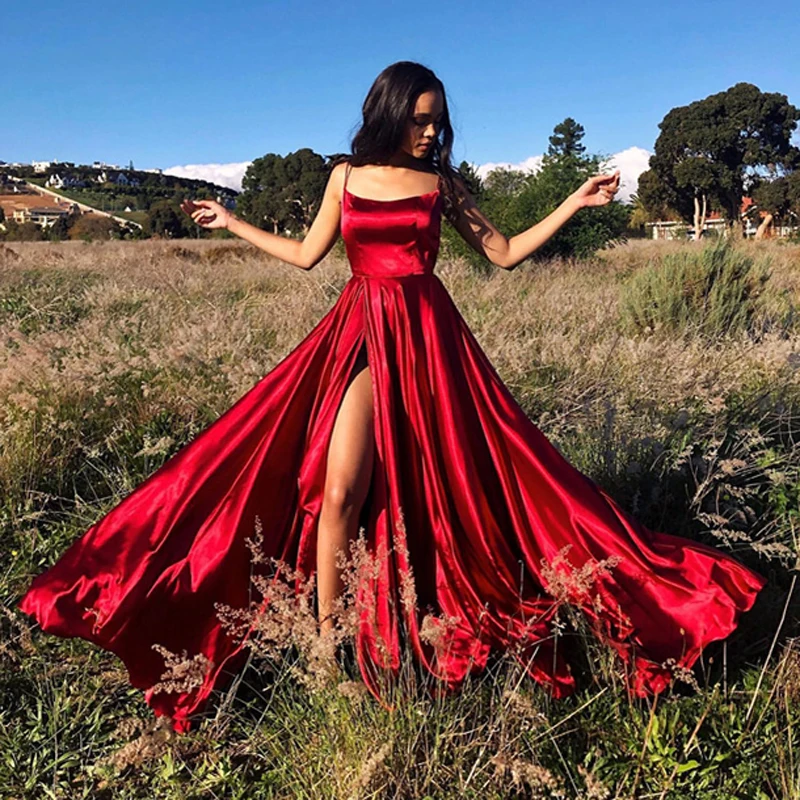 Женское атласное платье-трапеция, длинное платье с лямкой на шее, открытой спиной и разрезом спереди, платье для выпусквечерние вечера, 2021
