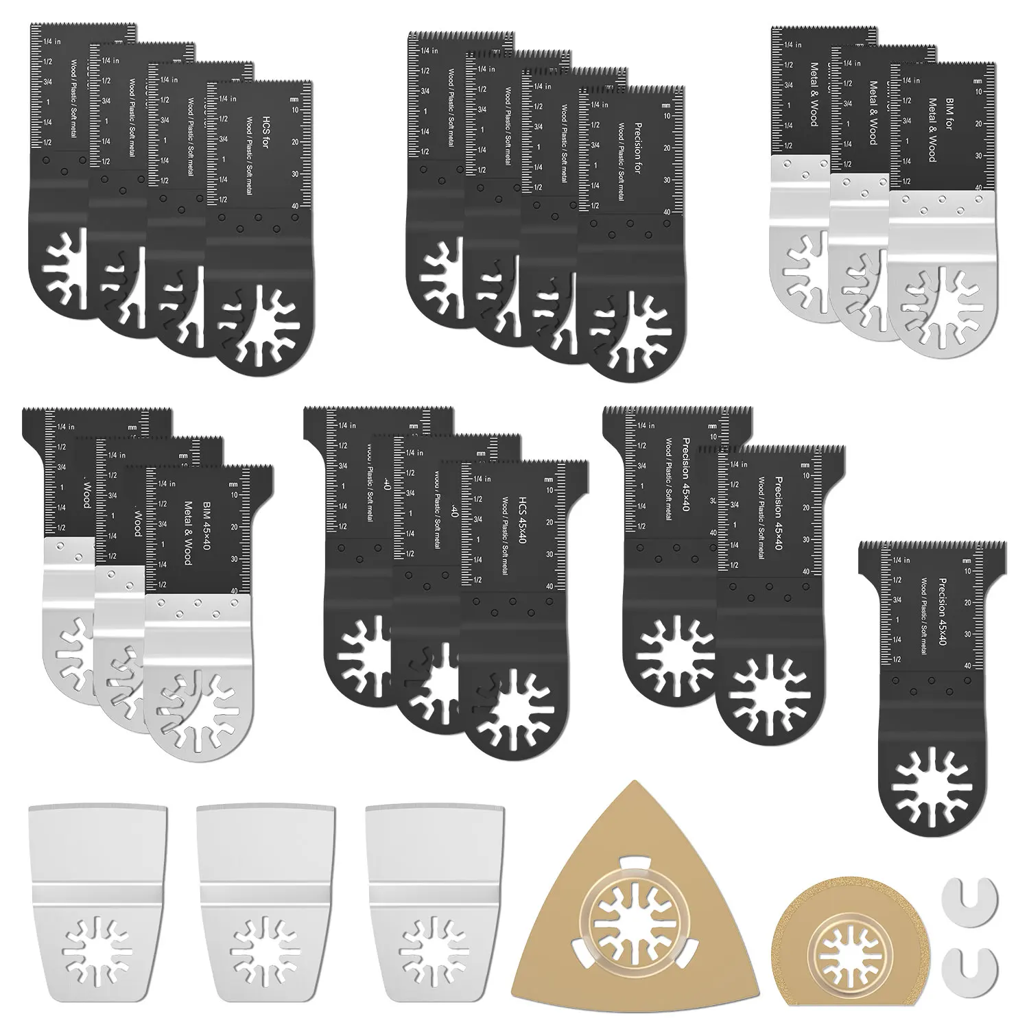 U-образная прокладка * 2 шт. 45 мм крупнозернистая лезвие пилы * 3 предмета в комплекте 45 мм тонкой зуб лезвие пилы * 3 предмета в комплекте 45MM биметаллическое лезвие пилы * 3 предмета в комплекте 35 мм биметаллический лезвие пилы * 3 предмета в комплекте 35 мм тонкой зуб лезвие пилы * 4 шт. 35 мм грубая зубная пила Лезвие * 4 шт. 52 мм нержавеющая сталь изогнутый шпатель * 3 80 мм треугольный сплав шлифовальный диск * 1 65 мм полукруглый сплав шлифовальный диск * 1