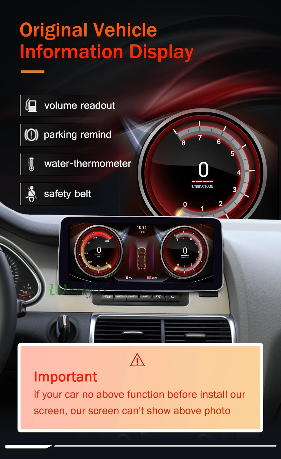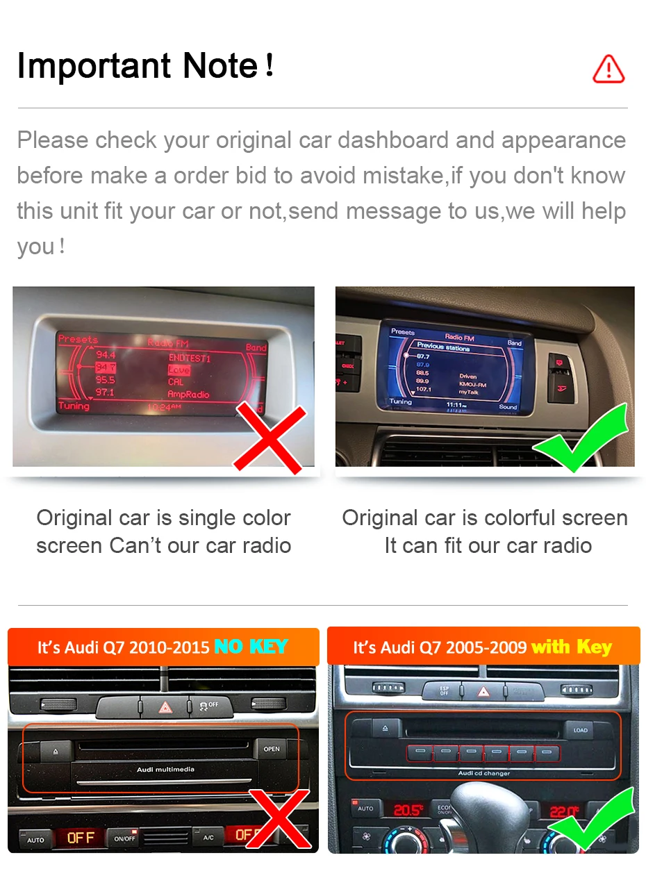 Пожалуйста, проверьте оригинальную приборную панель автомобиля и внешний вид, прежде чем сделать заказ, чтобы избежать ошибки. Если вы не знаете, что это устройство подходит для вашего автомобиля или нет, отправьте нам сообщение, мы поможем вам.Оригинальный автомобиль с одним цветным экраном не подходит для нашего автомобильного радиоОригинальный автомобиль-это цветной экран, который подходит для нашего автомобильного радио.