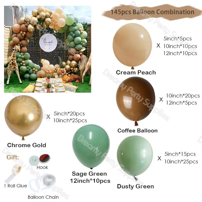 145 шт. Детские воздушные шары для душа, гирлянда Arch Dusty, зеленые, коричневые, золотые латексные воздушные шары, набор крема, персика, украшение для дня рождения