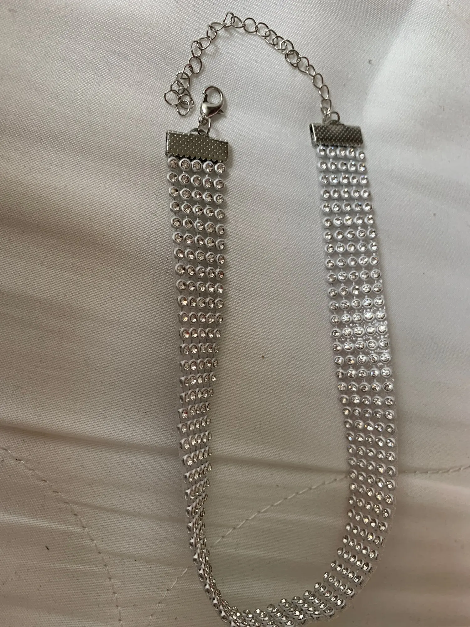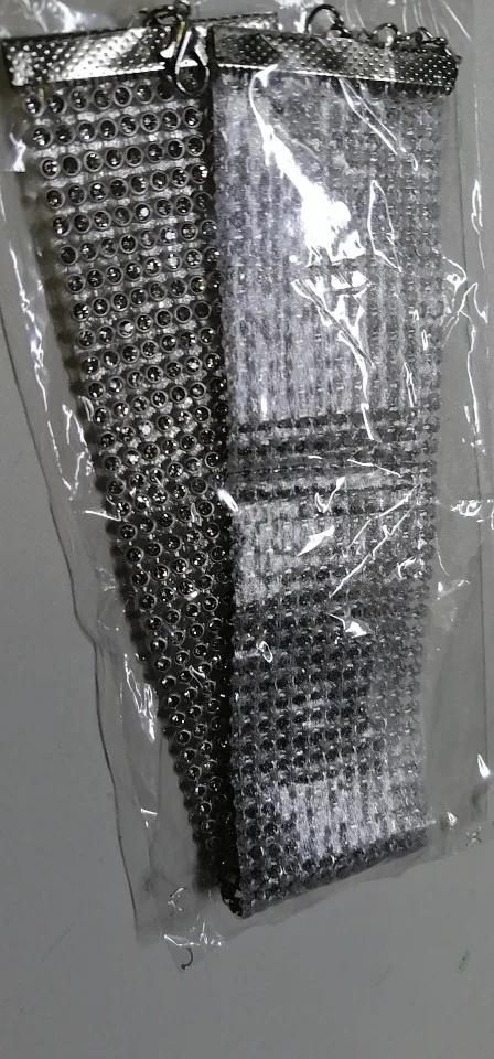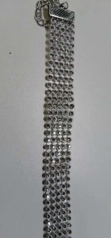 Вокруг страз не металлические, а пластиковые фиксановы и всё это прикреплено к матовой прозрачной полоске. За счёт этого чокер не блестит как на фото и выглядит дёшево, как в фикс прайса. Носить не буду, буду искать похожий но с металлический основой