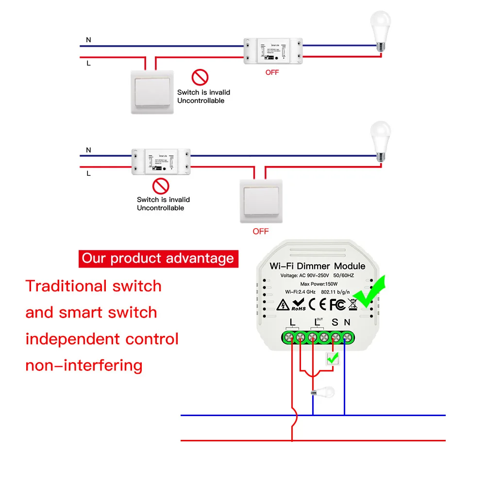 3. Wi-Fi управление через ваш мобильный телефон 2,4G сетей обеспечивает необходимое подключение к модулю диммера DIY без необходимости отдельного концентратора.
