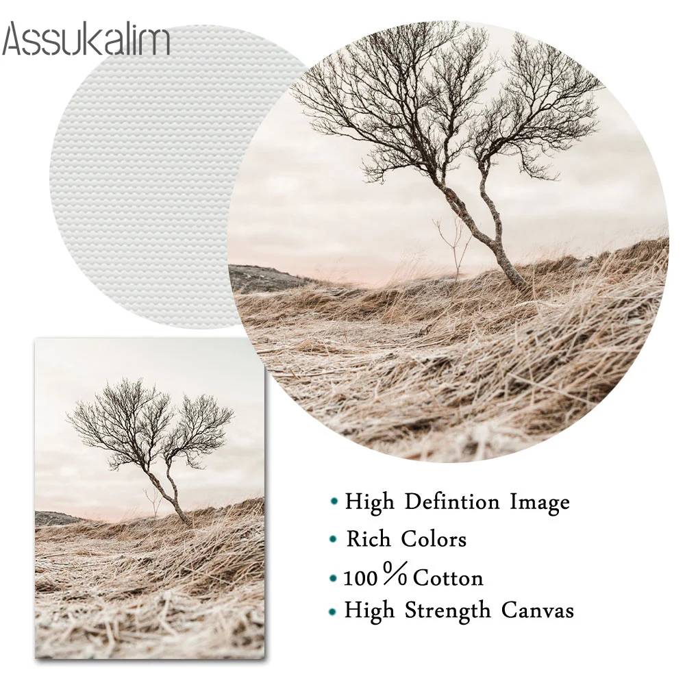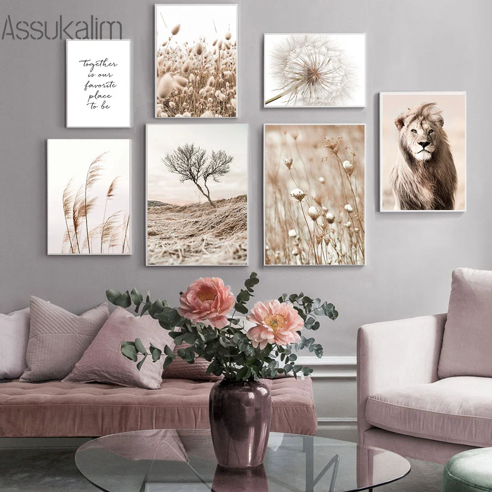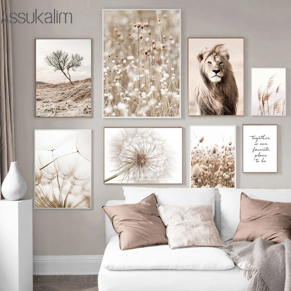 Бежевый настенный постер на холсте с изображением одуванчиков, камышей, деревьев, сена, плакаты со львом, пейзаж, настенные картины для декора гостиной