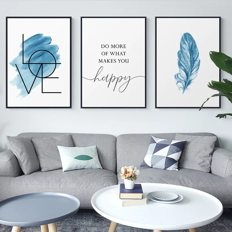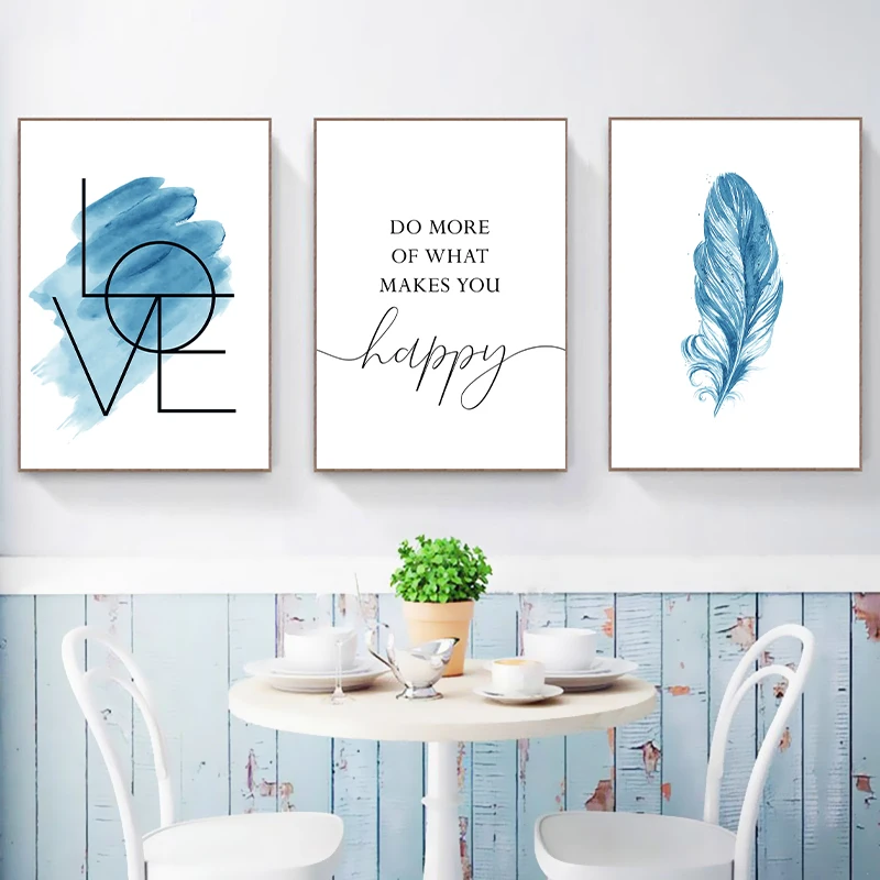 Синий настенный художественный плакат с перьями, Картина на холсте, вдохновляющие цитаты, печать, знак любви, картина для декора комнаты девочки, домашний декор