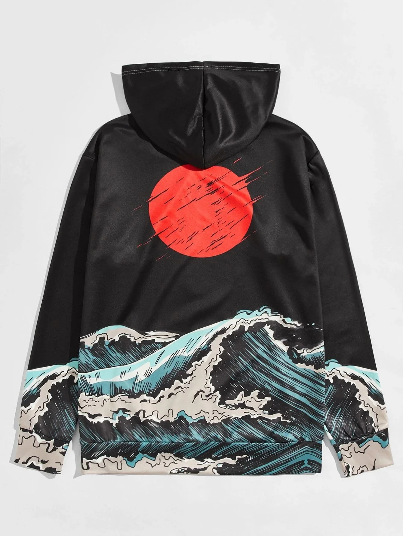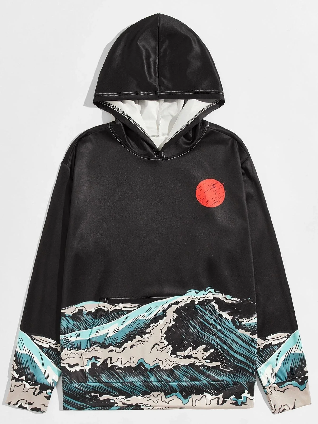 Худи мужское в японском стиле, уличная одежда с рисунком загара, повседневный пуловер с капюшоном и карманом кенгуру