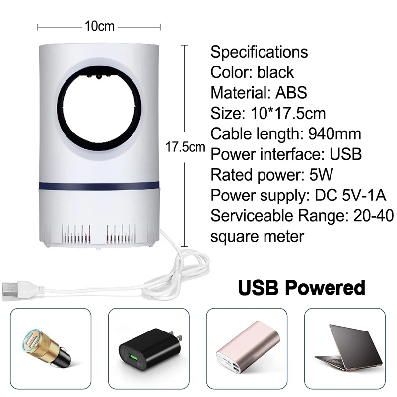 Особенности продукта:1. Отпугиватель вредителей Примечание: Пожалуйста, положите его в темное и закрытое место для лучшего эффекта и не ходите рядом с ним при использовании. Децибел продукта 35. Это не помешает вашему ребенку отдыхать и спать.2. Поддержка питания USB: подходит для всех видов источника питания USB, может быть легко заряжен планшетом, зарядным устройством или зарядным устройством для телефона с выходом 5 В/1-2 А. Идеально подходит для использования в помещении, спальне, учебе, санузле, палатке для кемпинга или в других закрытых помещениях. Низкое напряжение экономит энергию и безопасно для использования.3. Безопасность и гигиена: безопасность и гигиена: нет электрического шума, не химический, нетоксичный, безвкусный, нет радиации, безопасности и охраны окружающей среды для человека и домашних животных4. Всасывающий вентилятор на 360 градусов --- комары, летающие в близком расстоянии от любого направления, будут всасываться в ловушку насекомых со встроенной обтекаемой мощностью всасывания вентилятора, очень эффективно.5. Легко чистить: Просто снимите ящик для ловушки комаров, большая емкость для хранения комаров может легко удалить и справиться с мертвыми комарами с простым поворотом.6. Светодиодный светильник с 360-400нм фиолетовый светильник может легко привлечь комаров или других насекомых.7. Датчик, контролируемый светильник, будет автоматически выключен на рассвете и в сумерках Характеристики продукта:Материал: АБС-пластикВарианты цвета: белый, черныйНоминальная мощность: 5 Вт (лампа небольшого размера),7 Вт (лампа большого размера)Выход: 5 В/1 АСветильник источник: 360-400nmОбласть применения: 20-60 ㎡ (в помещении)Тип: насекомое Zap