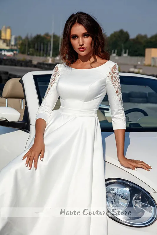 Пляжное Короткое свадебное платье, с рукавами, длиной до середины икры, винтажное, из мягкого атласа, элегантное, новинка размера плюс