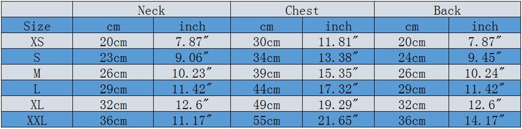 Размер --- Шея ------ грудь ------- задняя часть XS ---- 20 см/7,87 "------ 30 см/11,81" ------ 20 см/7,87" S ----- 23 см/9,06 "------- 34 см/13,38" ------ 24 см/9,45" М ---- 26 см/10,23 "------ 39 см/15,35" ------ 26 см/10,24" L ----- 29 см/11,42 "------ 44 см/17,32" ------ 29 см/11,42" XL ---- 32 см/12,6» ------- 49 см/19,29 "------ 32 см/12,6" XLL --- 36 см/11,17 "------ 55 см/21,65" ------ 36 см/14,17"