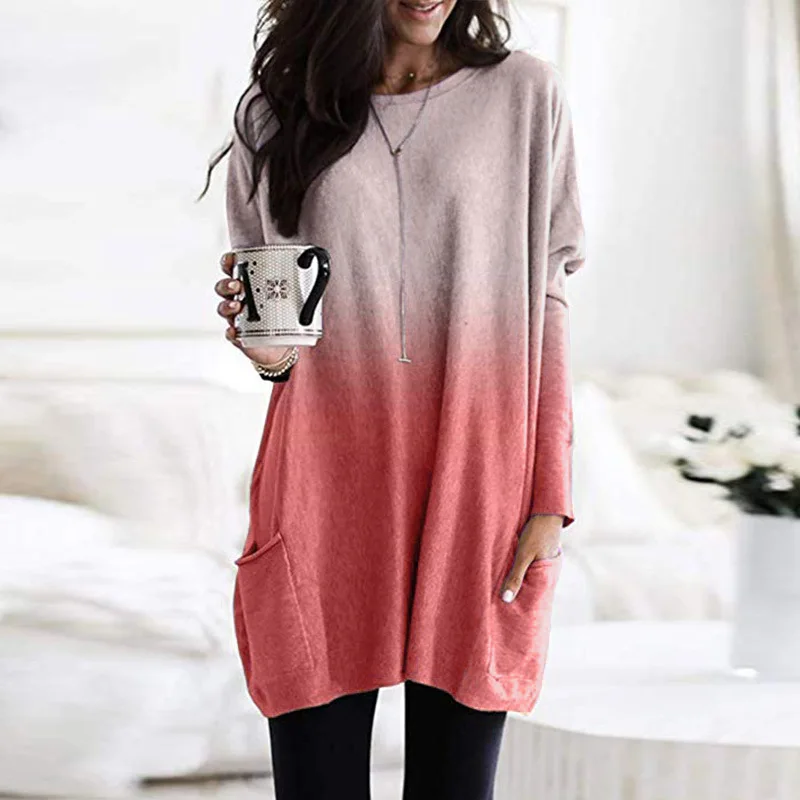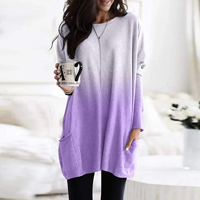 Футболки с длинными рукавами Цвет с О-образным вырезом, свободные, повседневные модельные туфли для женщин; Сезон весна-осень; С карманом топы с длинными рукавами размера плюс, женские платья с длинными рукавами