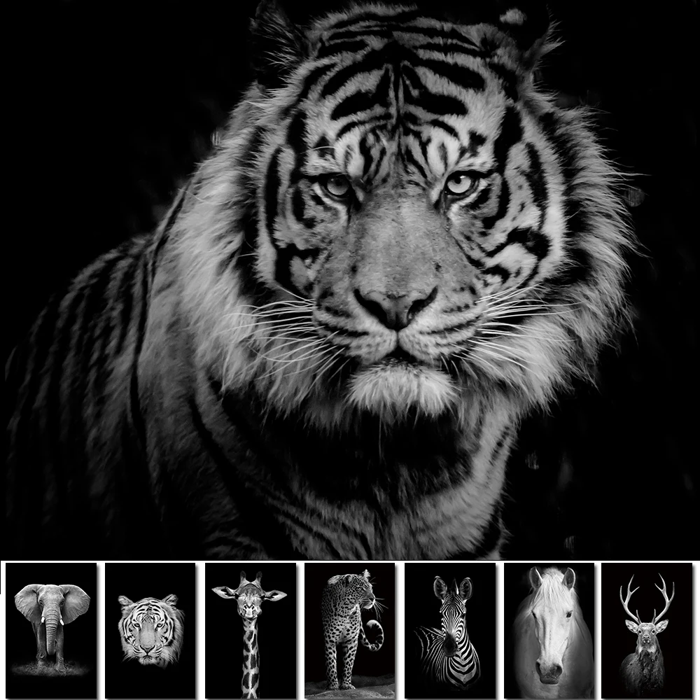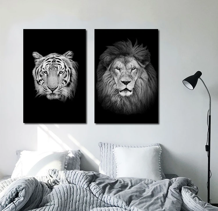 Картина на холсте с изображением черно-белых животных тигра льва и печать, Картина Настенная для украшения гостиной