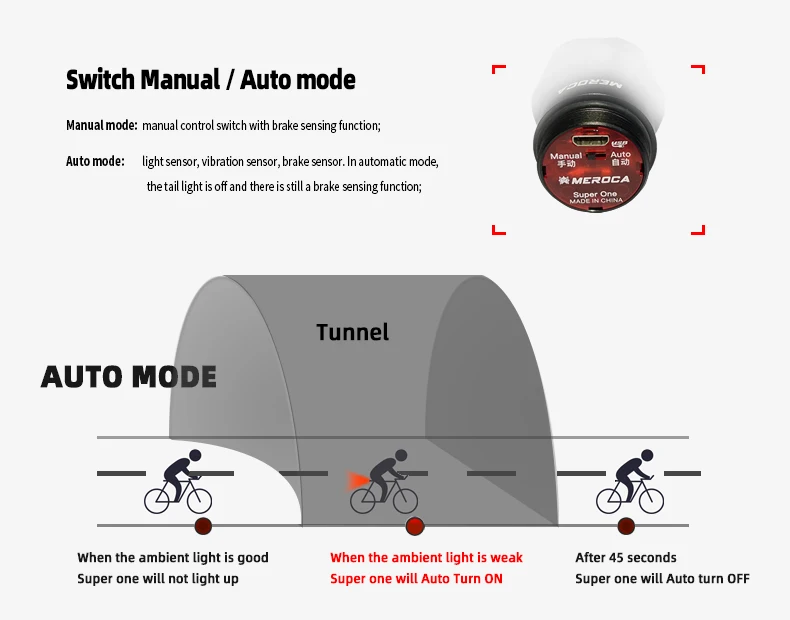 Ручной режим: ручной переключатель управления с функцией обнаружения тормозов; Автоматический режим: датчик на светильник, датчик вибрации, Датчик тормоза. В автоматическом режиме задний светильник выключен, и все еще есть функция обнаружения тормозов;