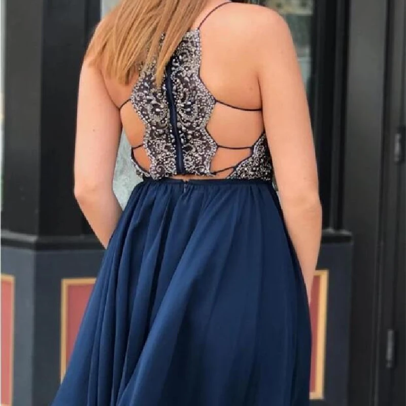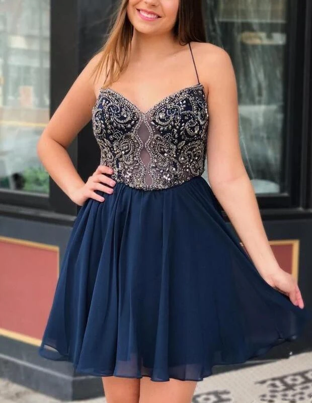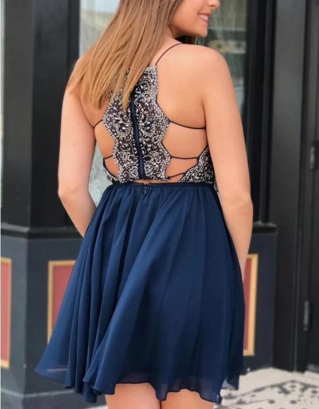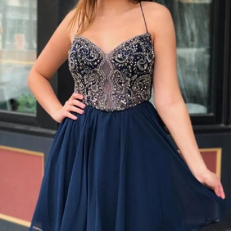 Пикантная обувь на тонких бретелях темно синие Бальные платья 2021 трапециевидной формы с бисерной вышивкой и кружевами, с украшением в виде кристаллов длиной выше колена Короткие Выходные туфли на выпускной бал вечернее платье с застежкой-молнией