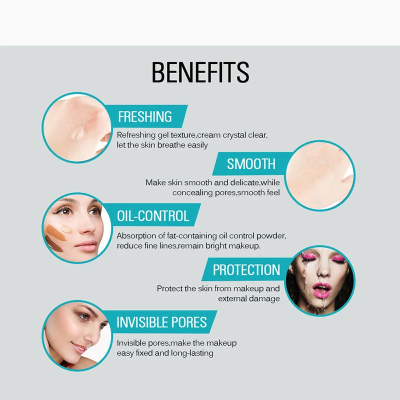 Характеристика: Шелковистая текстура, Контроль масла, Матовый вид, Невидимые поры, Гладкие тонкие линии, Сделайте стойкий макияж в течение 8 часов. Описание Уникальный прозрачный силиконовый гель-основа, шелковистая и натуральная кожа, отражающий светильник. Свежая гелевая текстура позволяет вашей коже дышать свободно, без нагрузки. Содержит порошок с контролем жирности, который может поглощать излишки кожного сала и подготовить кожу, чтобы помочь макияжу оставаться в течение длительного времени. Использование Возьмите соответствующее количество грунтовки пальцем, намажьте кружком на зоне, которая выделяет слишком много масла. Качество: натуральный минерал, органические ингредиенты, не содержит спирта, не чувствителен, безопасен для тестирования Подходит: все типы кожи Состав: Циклометикон, диметикон/дивинилдиметикон/Silsequioxane Crosspolymer, Laureth-12, Изододекан, Нейлон-12, сквалан, PEG-10 диметикон, полиметилсиоксикан.