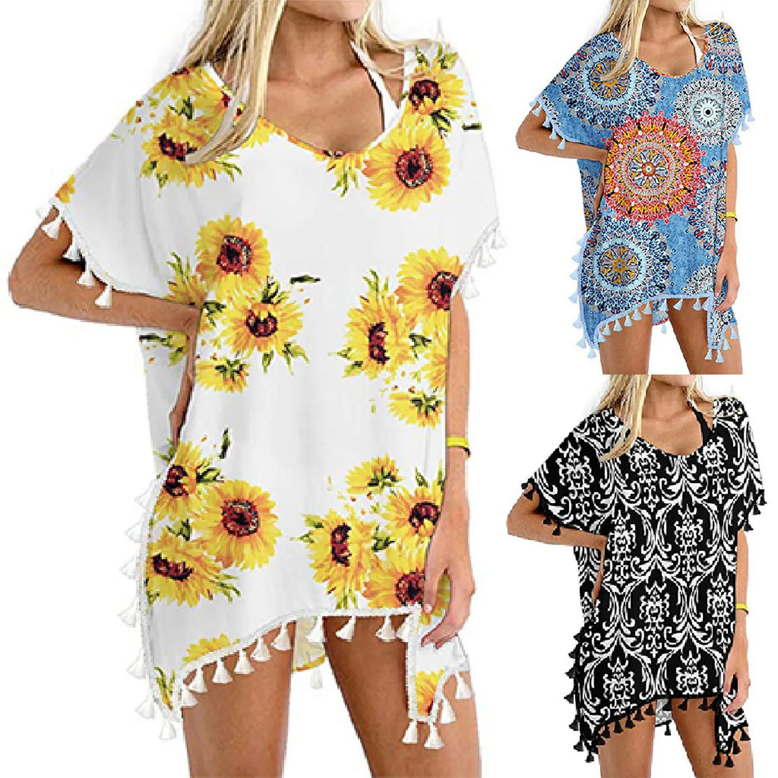 Отделкой кафтан шифоновые кисточки купальник женский пляжный Loose Bikini Cover Up с цветочным рисунком топы с короткими рукавами и круглым вырезом, одежда для девушек