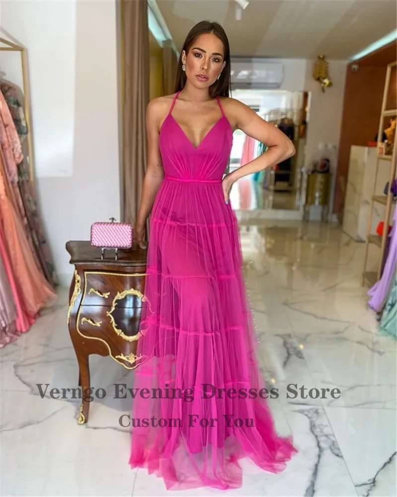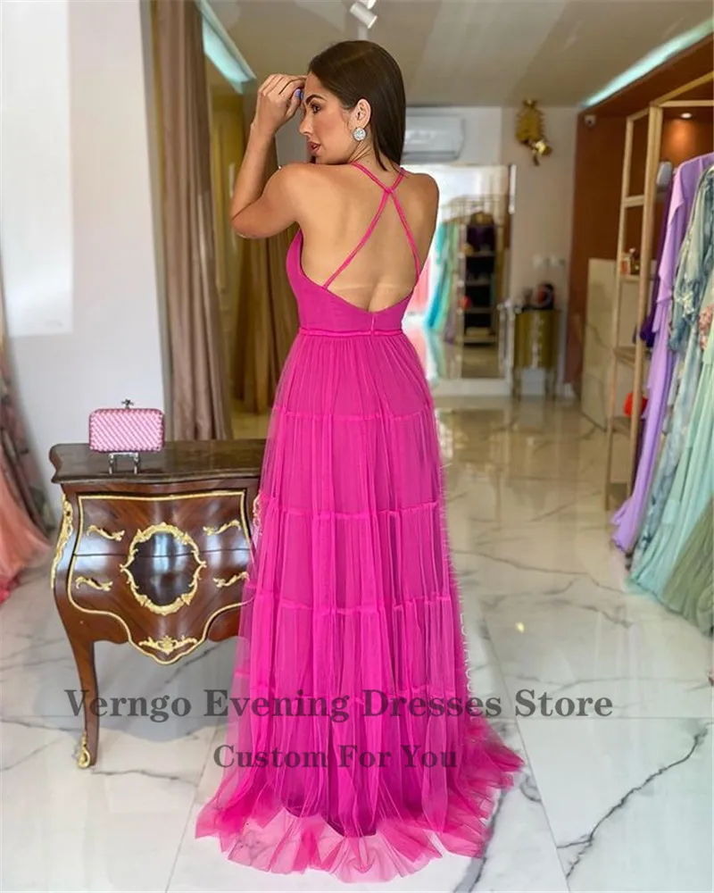 Verngo 2021 ярко-розовое Тюлевое ТРАПЕЦИЕВИДНОЕ длинное платье для выпускного вечера сексуальное платье с лямкой через шею и открытой спиной до пола вечернее, по случаю платья