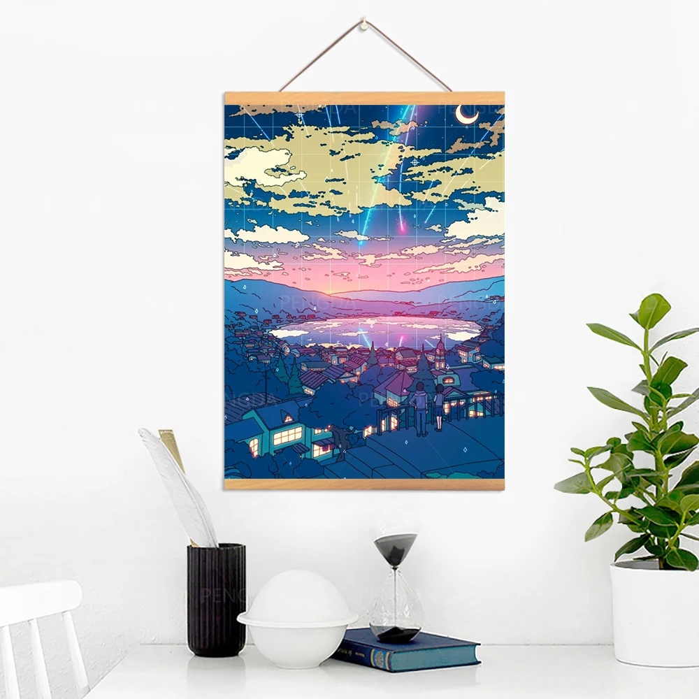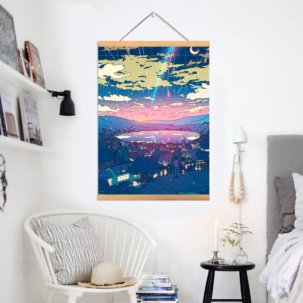Wall Art деревянный прокрутки подвесная Картина Пейзаж Живопись холст изображения HD печати постер японское аниме украшения дома ночной фон