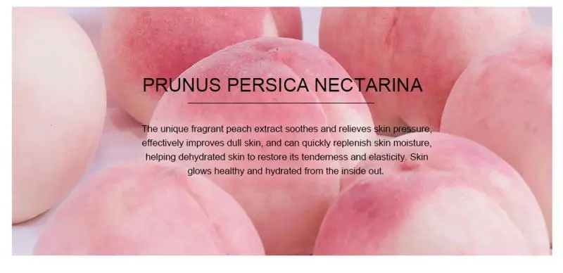 Содержит уникальный ароматный экстракт персика, который может эффективно снять напряжение кожи, улучшить тусклость кожи и быстро пополнять влагу, чтобы помочь обезвоженной коже восстановить мягкость и эластичность.