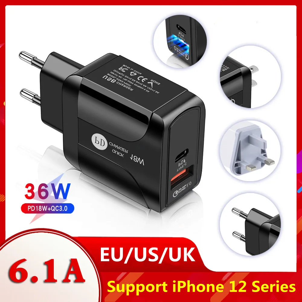 Быстрое зарядное устройство USB 36 Вт, быстрая зарядка 3,0, Тип C PD, быстрая зарядка для iPhone 12, 11, зарядное устройство USB с QC 4,0, 3.0, быстрое зарядное устройство