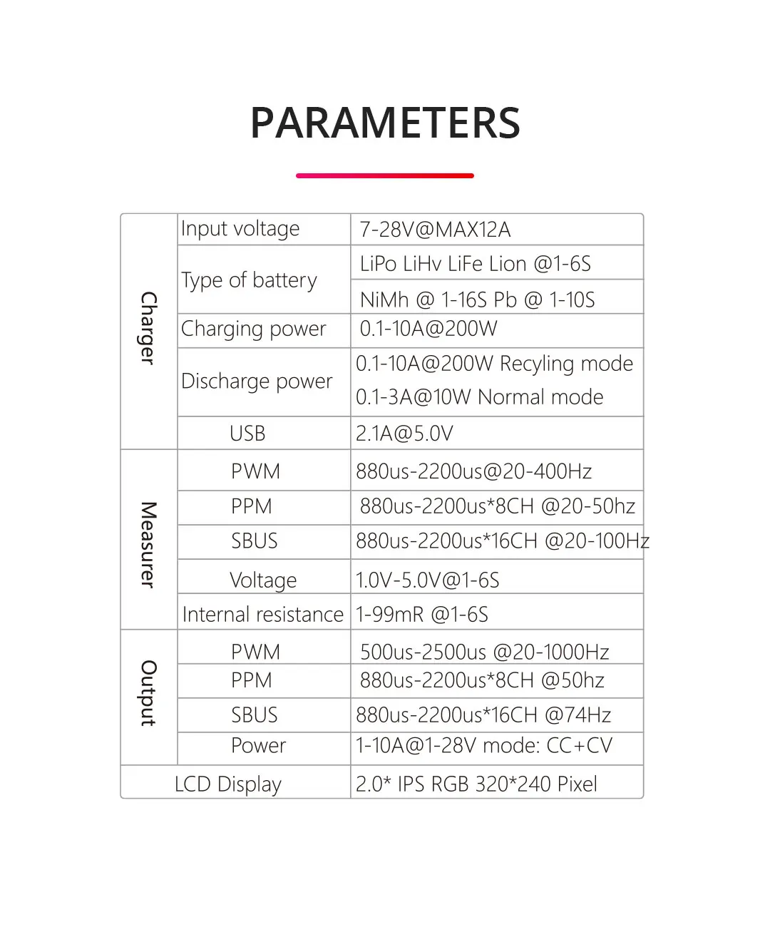 Размер изделия: 73*51*27 ммВес изделия: 90 гРазмер упаковки: 84*79*39 ммВес упаковки: 150 гЖК: IPS 2,0 дюймов LCD 320*240 пикселейВходное напряжение: 7,0-28,0 в @ MAX 12AТип батареи: Lipo LiHV LiFe Lion @ 1-6NiMh @ 1-16S Pb @ 1-10SБаланс тока: 400mA @ 2-6SМощность зарядного устройства: 200 Вт @ MAX 10AМощность разряда: 200 Вт @ MAX 10A режим рециркуляции10W @ 3A нормальный режимUSB: 2.1A @ 5,0 V или обновление