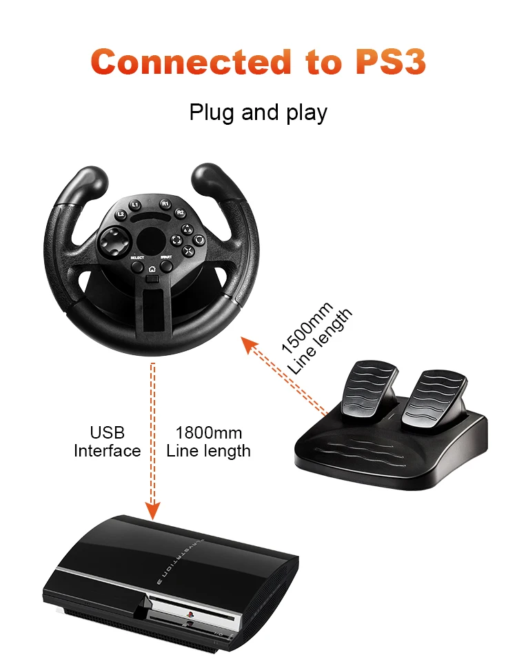 Гоночное Колесо включает в себя Блок руля и блок ножной педали. Соединить их довольно просто. Однако сначала необходимо выключить игровую консоль перед подключением гоночного колеса. А. Подключение блока ножной педали к нит руля. Для имитации реального опыта вождения вы можете использовать Педальный блок foof для контроля ускорения и торможения. Для подключения устройства thistwo просто Подключите штекер типа «папа», находящийся на Педали Ног, к основанию рулевого колеса. В. Подключение гоночного колеса к игровой консоли. Подключите кабель от блока рулевого колеса к консоли Примечание: Пожалуйста, убедитесь, что блок рулевого колеса находится в начальном положении при включении вашей игровой системы. Если рулевое колесо находится в нейтральном положении, то это положение будет считаться нейтральным при включении вашей игровой системы.