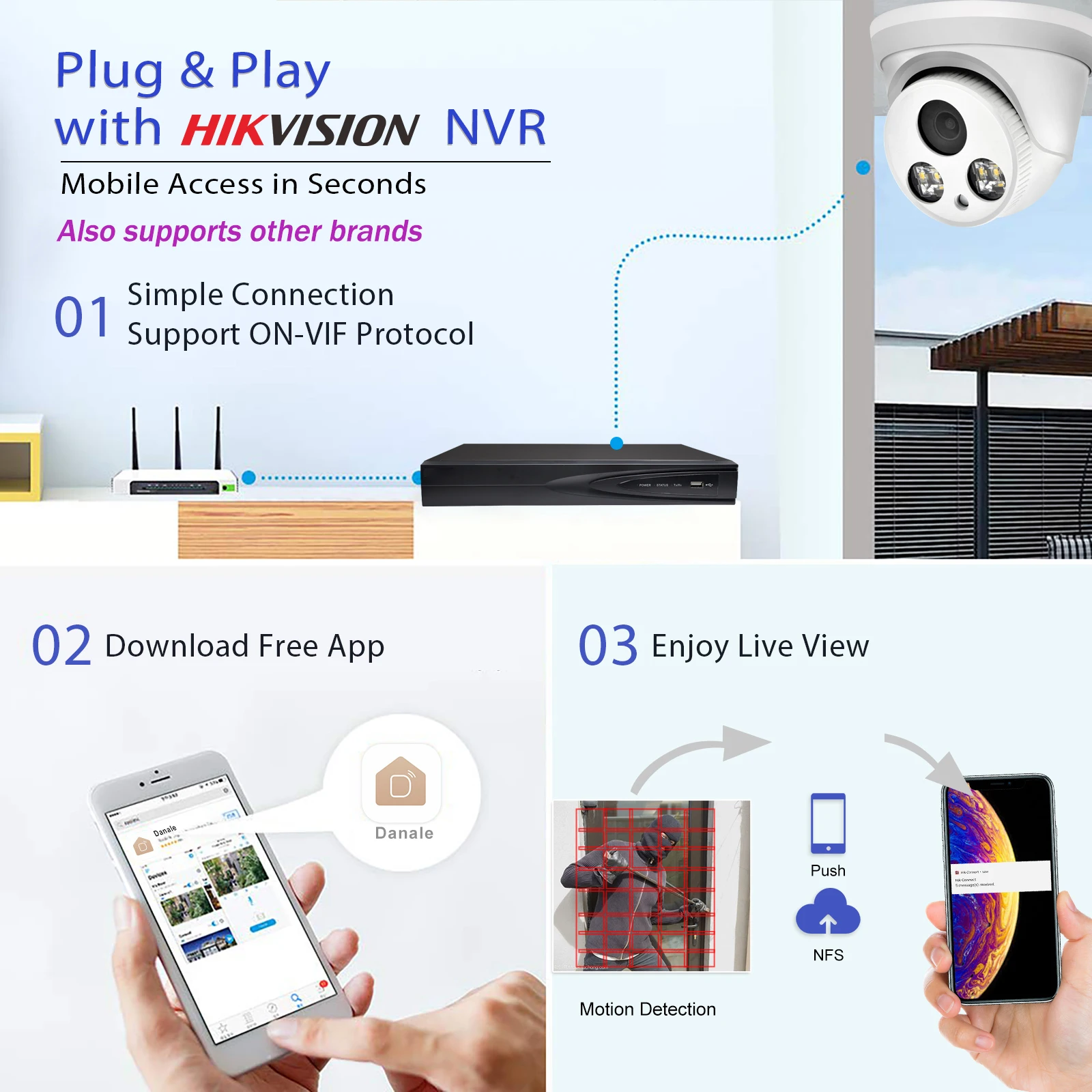 1. Hikvision compatible, make the camera can easily install and connect with Hikvision NVR.2. Hikvision NVR, Top brand of the CCTV security. most powerful recorder and security for your house.3.5MP HD Resolution4.Audio record sound IP Camera5.Motion detection,instant e-mail alert;6.Colorful Night Vision ;7.NVR support H.265+ encode: save HDD storage space;8. Support multi-languages: English, Russian, French, Korean, Spanish., etc;9. Plug and play, remotely view by Android & iOS System (APP: Hik-connect)