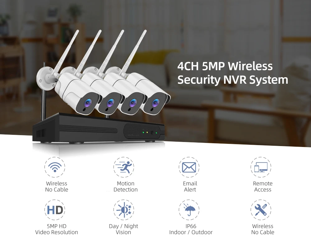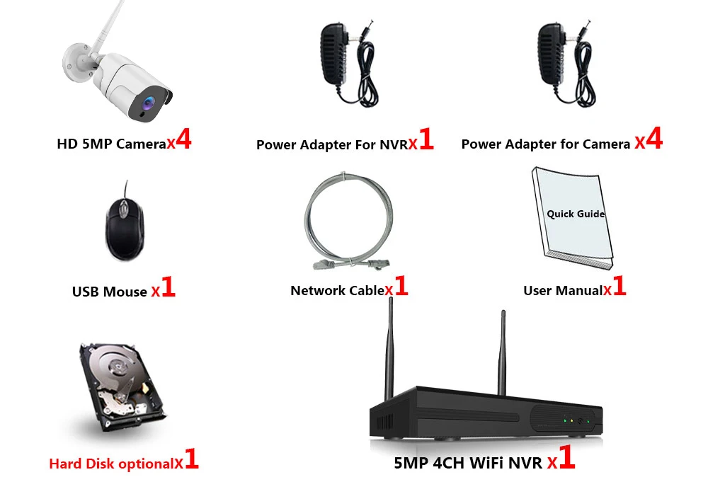 1x 4CH 5MP Беспроводной NVR 4x пулевые камеры 4x источник питания для камеры 1x источник питания для NVR 1x USB мышь (подарок) 1x 3 фута 1 м Ethernet кабель (подарок) 1x быстрая направляющая