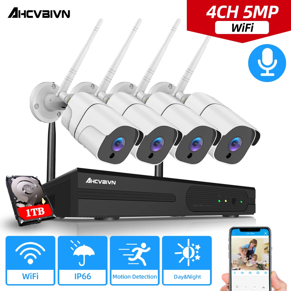 4-канальная беспроводная камера видеонаблюдения с Wi-Fi, домашняя система видеонаблюдения, H.265, сетевой видеорегистратор, 4 шт., 5-мегапиксельная IP цилиндрическая камера видеонаблюдения, комплект видеонаблюдения с Wi-Fi