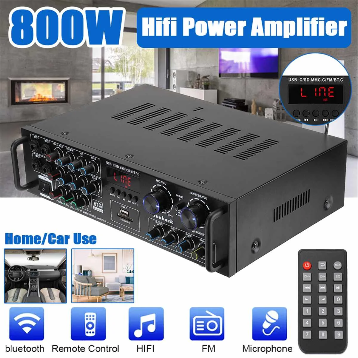 Особенности:-Миниатюрный цифровой усилитель мощности звука bluetooth HIFI.-TF-карта, AUX, U-диск, воспроизведение форматов MP3, поддержка беспроводного соединения bluetooth.-Поддерживает FM стерео радио.-Поддержка 4-х полосного входа микрофона.-С высокими частотами, басами и регулятором громкости, очень прост в использовании.-Низкие искажения обеспечивают более четкий, мощный и мощный звук.-Выход 5 каналов.-С функцией дистанционного управления.-Модернизированная Высокая мощность 2000 Вт-Питание постоянного/переменного тока, подходит для домашнего использования.-Он может автоматически переключать напряжение.-Небольшое тепло светильник вес.
