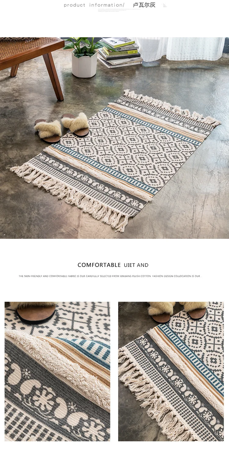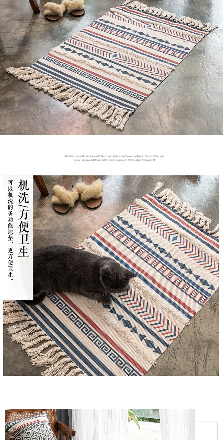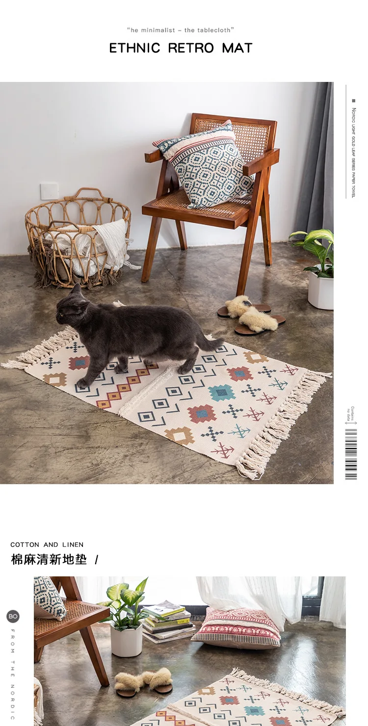 Красивый и щедрый ткацкий коврик, чистое ручное плетение, длительный процессКультура-это не только искусство, но и культурное достояниеДизайн ткачества с кисточками увеличивает чувство дизайна напольного коврикаХлопок и конопляная растительная печать и окрашивание, в сочетании с современной технологией печати и окрашивания, не выцветает, не содержит формальдегида, растительное сырье безопаснееПростой дизайн, это литературный маршрут, Ключом является сочетание цветов, полный литературный стиль