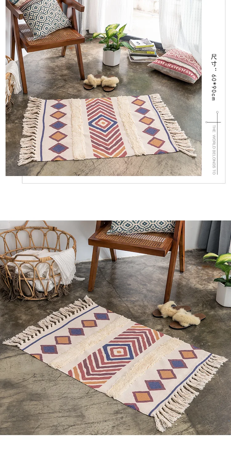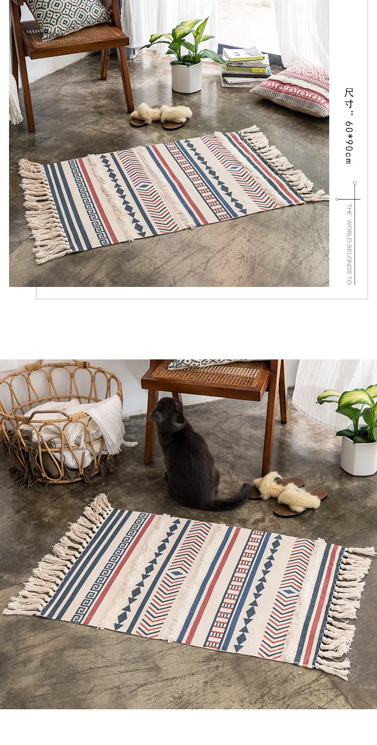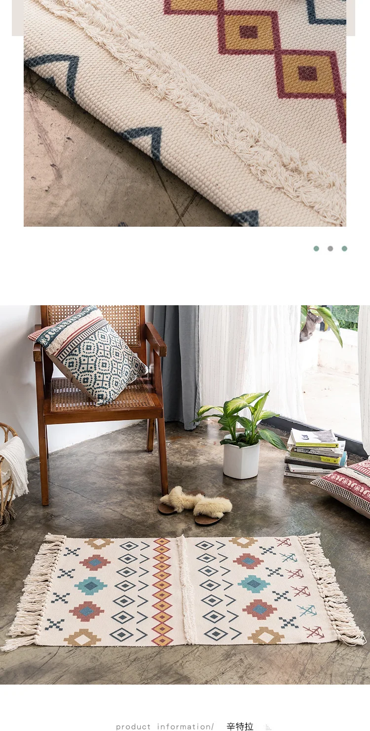 Красивый и щедрый ткацкий коврик, чистое ручное плетение, длительный процессКультура-это не только искусство, но и культурное достояниеДизайн ткачества с кисточками увеличивает чувство дизайна напольного коврикаХлопок и конопляная растительная печать и окрашивание, в сочетании с современной технологией печати и окрашивания, не выцветает, не содержит формальдегида, растительное сырье безопаснееПростой дизайн, это литературный маршрут, Ключом является сочетание цветов, полный литературный стиль