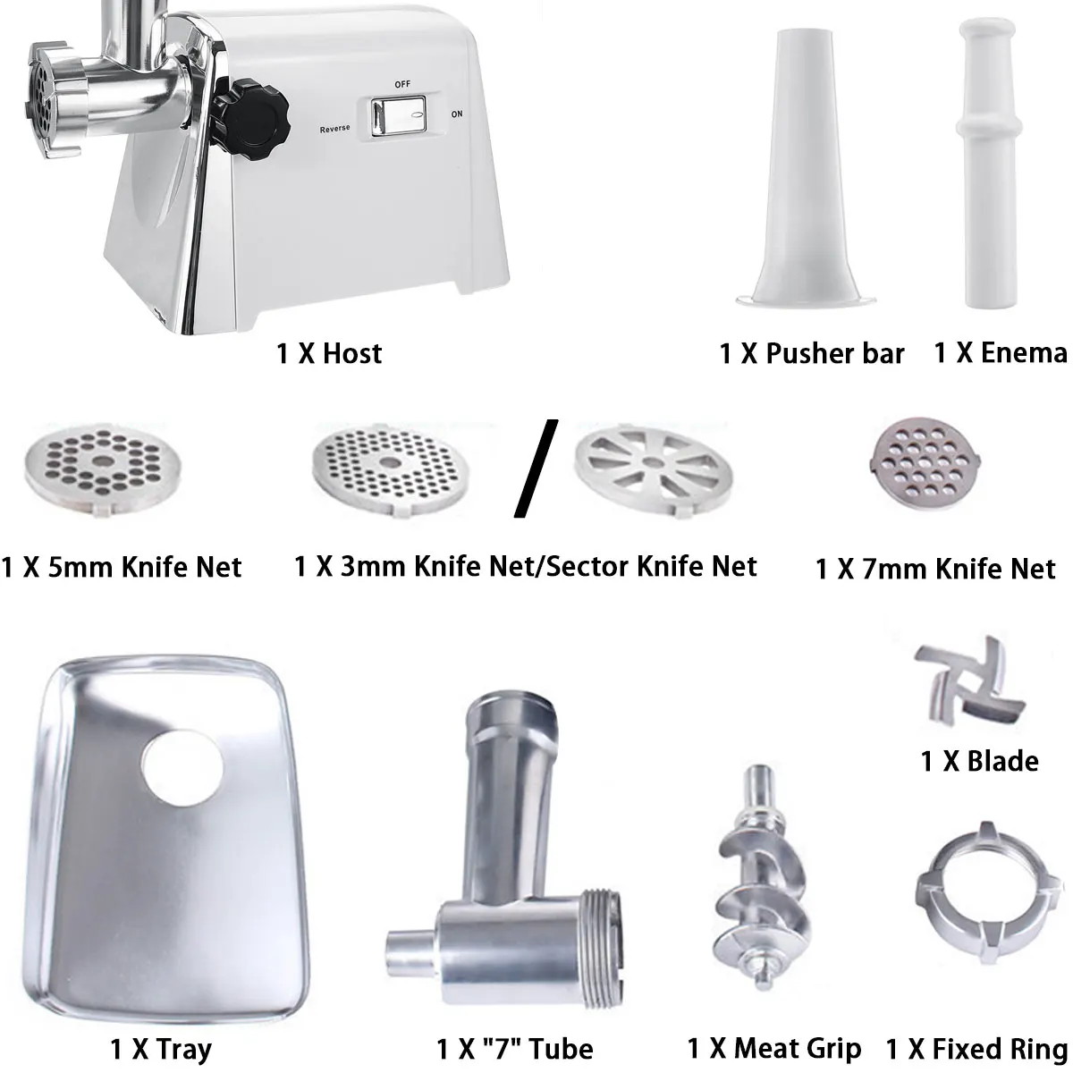 Посылка включает в себя:1 хост1 лоток1 X лезвие1 клизма1 X трубка "7"1 х рукоятка для мяса1 X толкатель1 фиксированное кольцо1X7 мм Сеть ножей1X5 мм Сеть ножей1X3 мм Сеть ножей/секторная сеть ножей