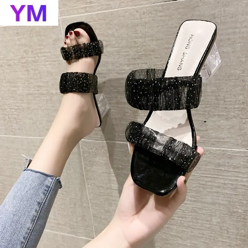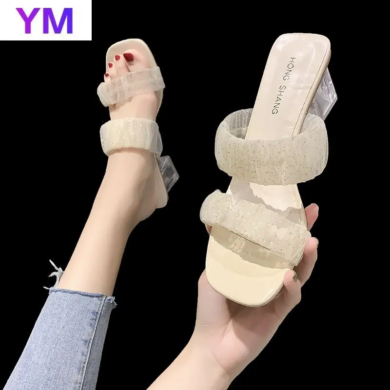 Сандалии женские на прозрачном каблуке, пляжные шлепанцы с жемчугом...