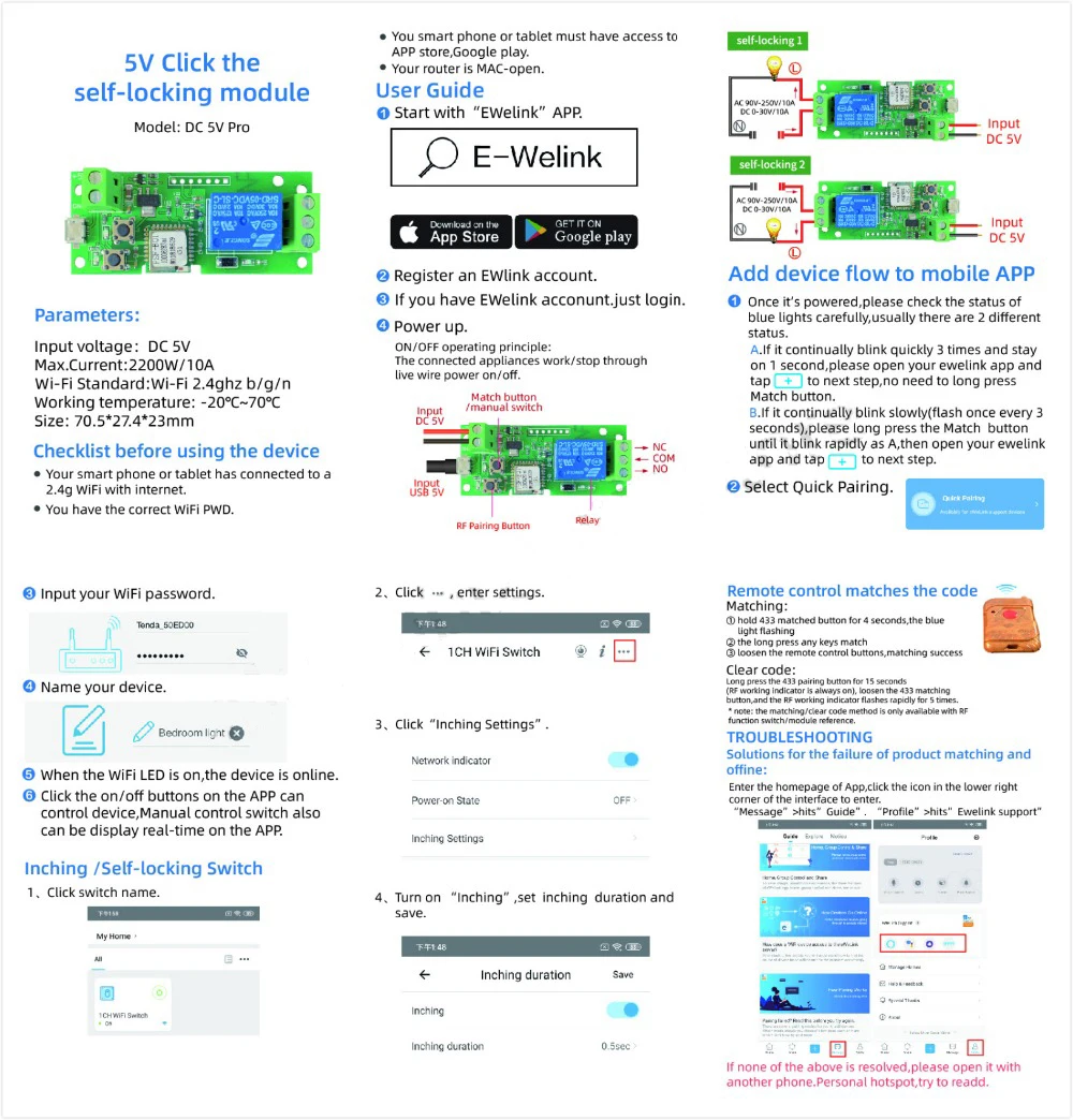 Этот продукт является беспроводным переключателем, поддерживающим режим инширования/самоблокирования. Пользователи могут добавить устройство в приложение eWeLink для удаленного управления подключенными бытовыми приборами или устройствами. В режиме самоблокировки клиенты могут удаленно включать/выключать подключенные устройства немедленно. В режиме инчинга клиенты могут выбрать два способа подключения:* Включите 1s, а затем автоматическое выключение* Выключите 1s, а затем автоматическое включение.Продукт обеспечивает дистанционное управление бытовой техникой через мобильное приложение eWeLink, доступное как на Android, так и на iOS.