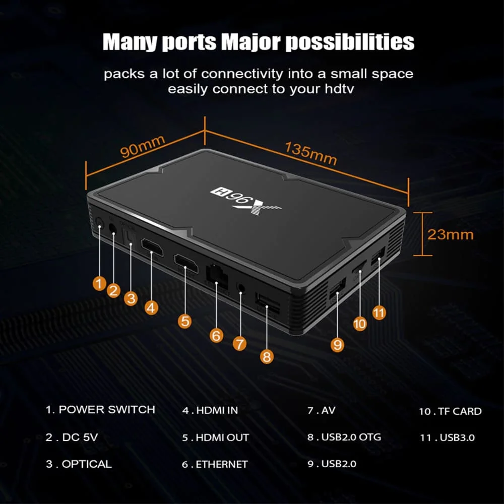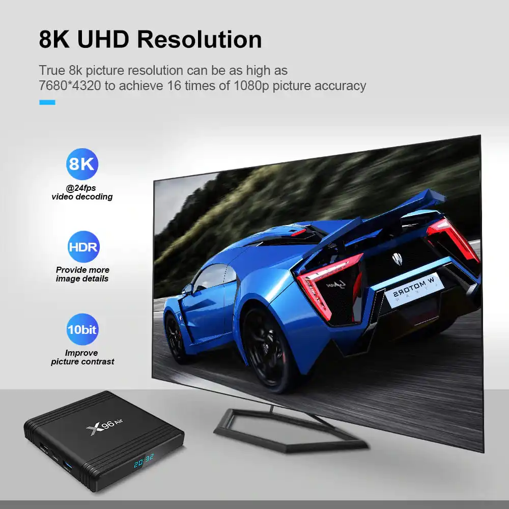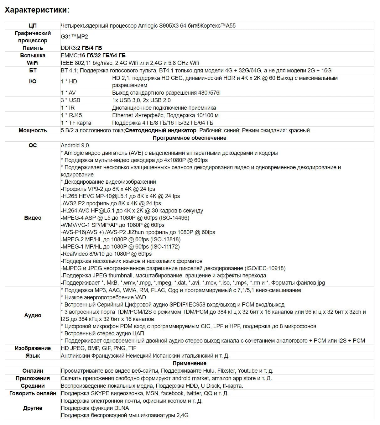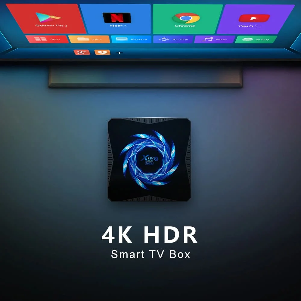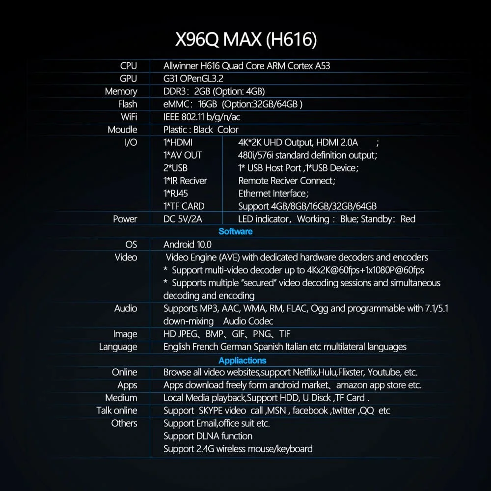 Основные особенности: ● ОС: Android 10.0, отличная совместимость. Большое хранилище, может содержать больше приложений, которые вам нравятся. Адаптируя операционную систему Android 10.0, X96Q Max совместим с большим количеством программного обеспечения, игр и приложений, улучшая пользовательский опыт. ● 2,4 / 5 ГГц Wi-Fi + BT5.0 ● 4 ГБ ОЗУ + 32 ГБ ПЗУ. 4 ГБ ОЗУ + 32 ГБ ROM предоставляют достаточно места для быстрой работы устройства. Поддерживает чтение карт TF до 64 ГБ, это также значительно повышает надежность вашего ТВ-бокса ● HEVC H.265 и VP9 Аппаратное декодирование H.265 и vp9 может сэкономить 50 процентов ресурсов полосы пропускания, позволяет плавно смотреть фильм в формате 4k, четкость каждой детали экрана. ● Разрешение UHD 8K X 4K Поддерживает аппаратное декодирование видео UHD 8k x 4k, что обеспечивает просмотр в высоком разрешении и плавное воспроизведение видео, что делает его сигналом с самым высоким разрешением, доступным для домашних фильмов