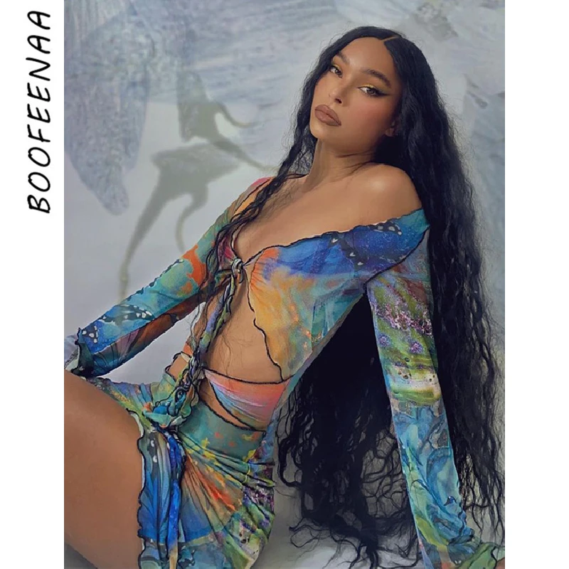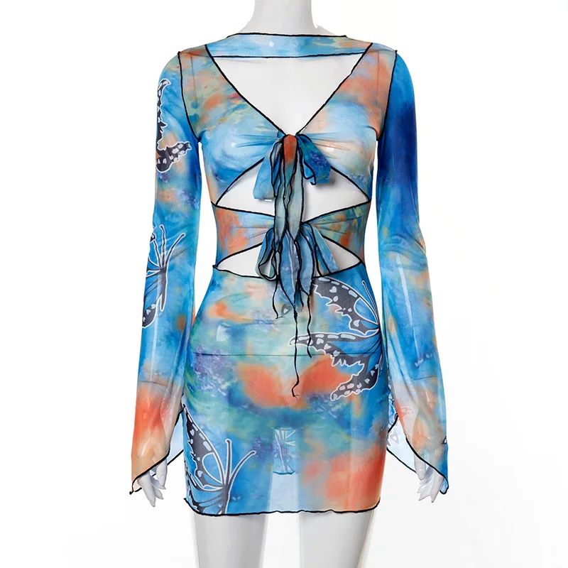 BOOFEENAA эстетическое мини-платье с бабочками и принтом тай-дай Y2k сексуальное Клубное платье в обтяжку с вырезом и длинными рукавами C85-BF12