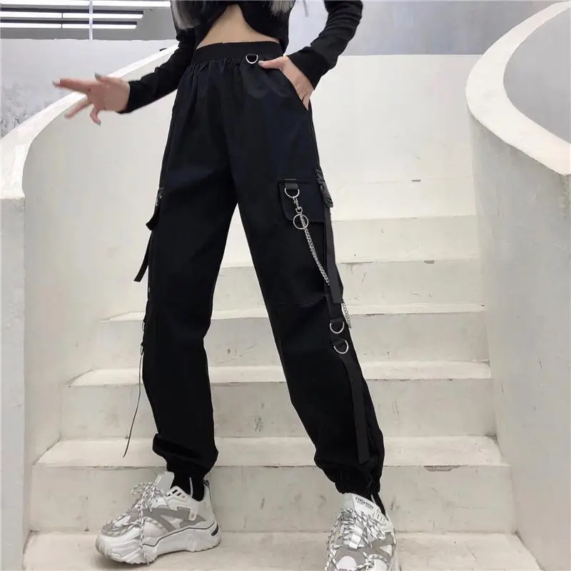 HOUZHOU панк Брюки карго для пробежек Женские Гот, Харадзюку цепь ч...
