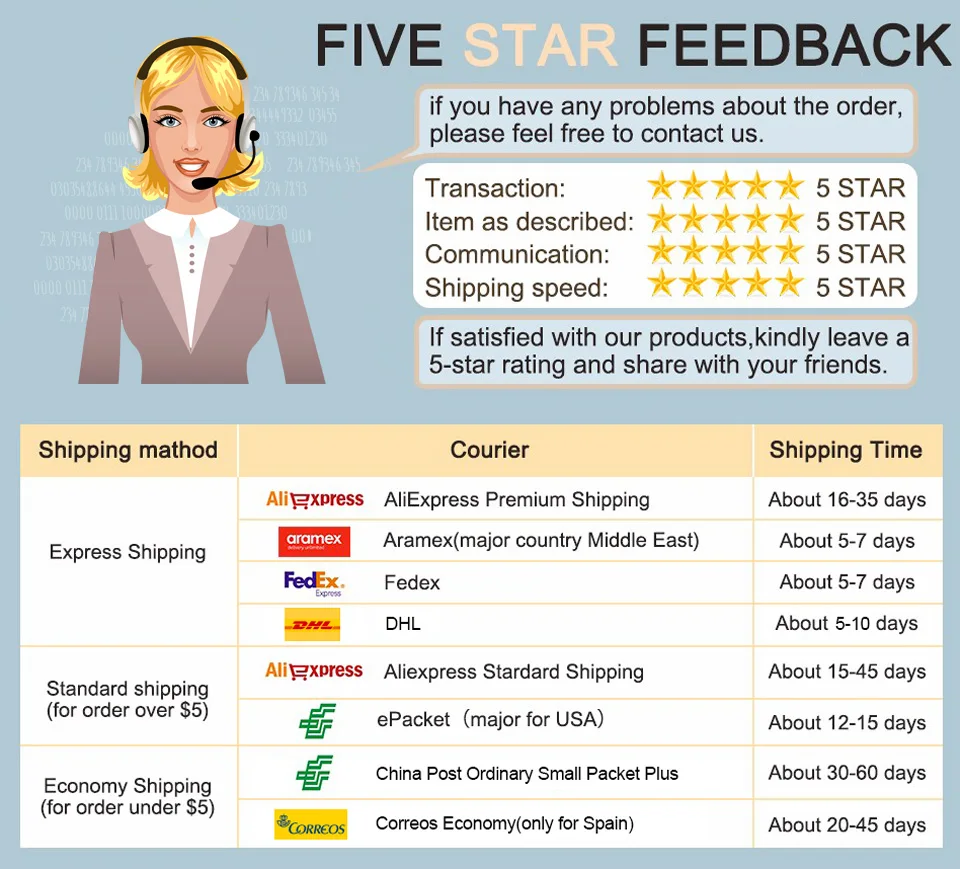 3. Пожалуйста, оставьте отзывы в 5 звезд. Если вы удовлетворены нашими продуктами, это очень важно для нас. Если у вас есть какие-либо вопросы, пожалуйста, свяжитесь с нами, мы обслужим вас на aliexpress.